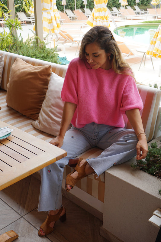 Maille en laine à manches courtes Brune rose bonbon