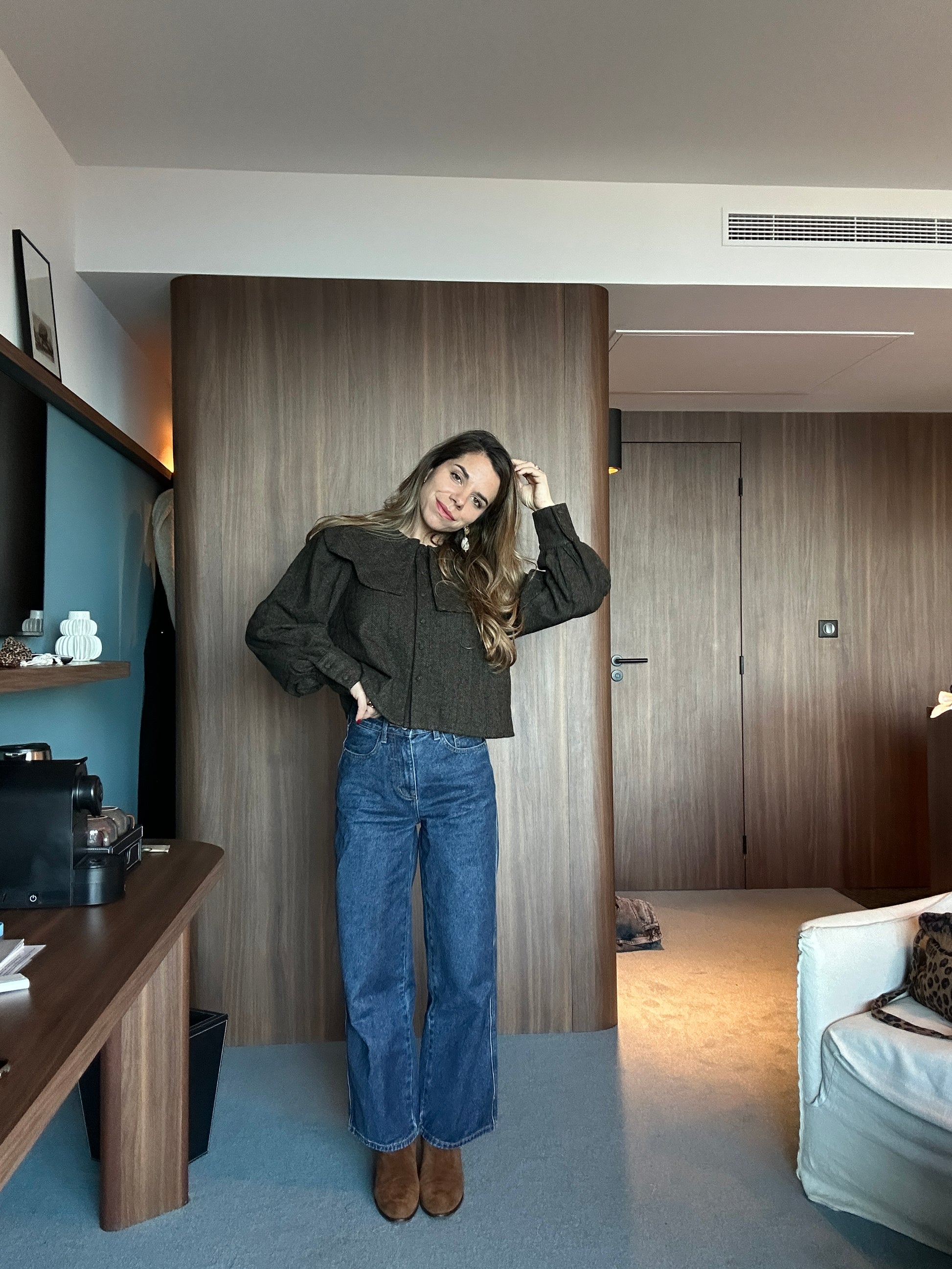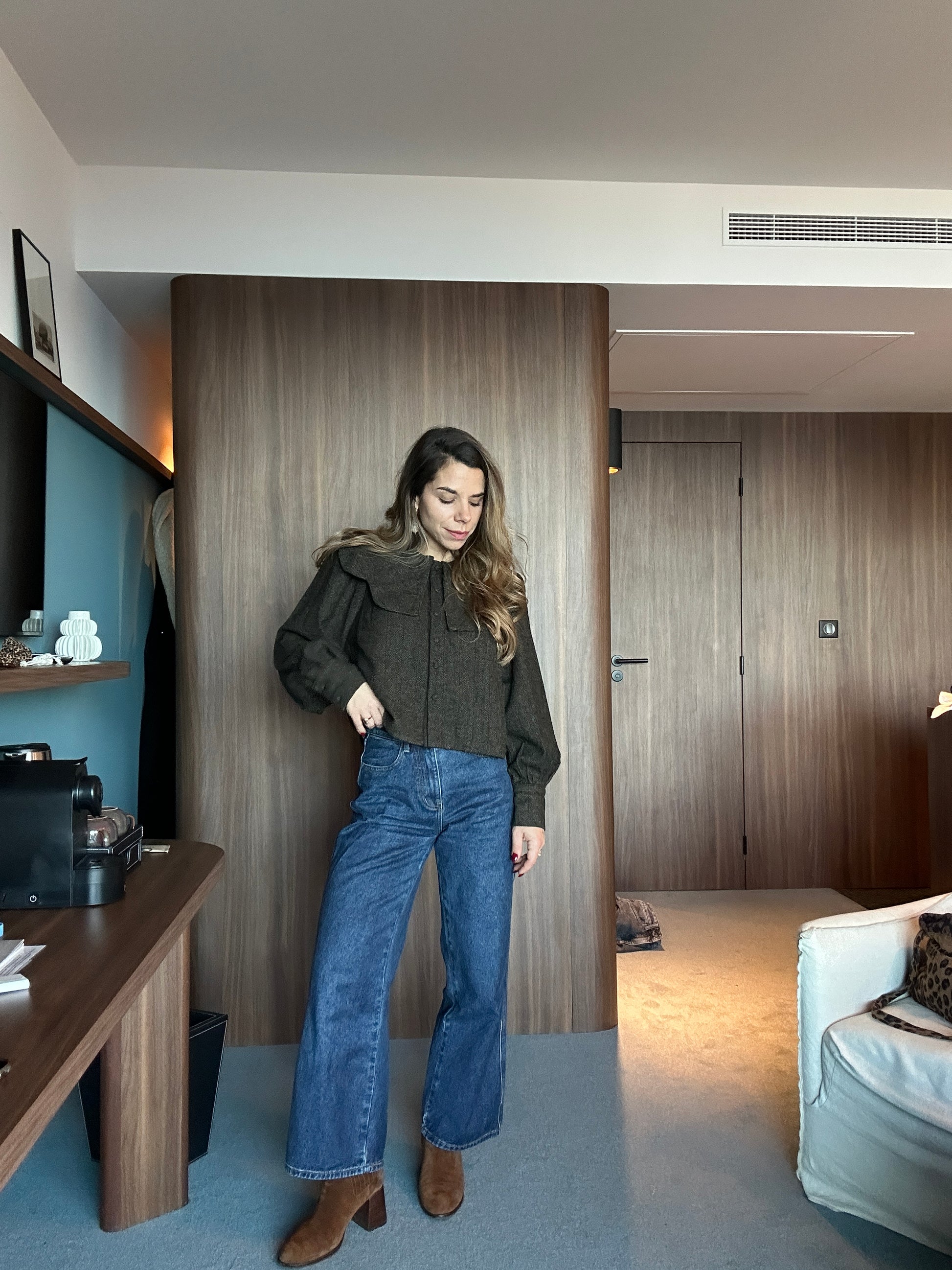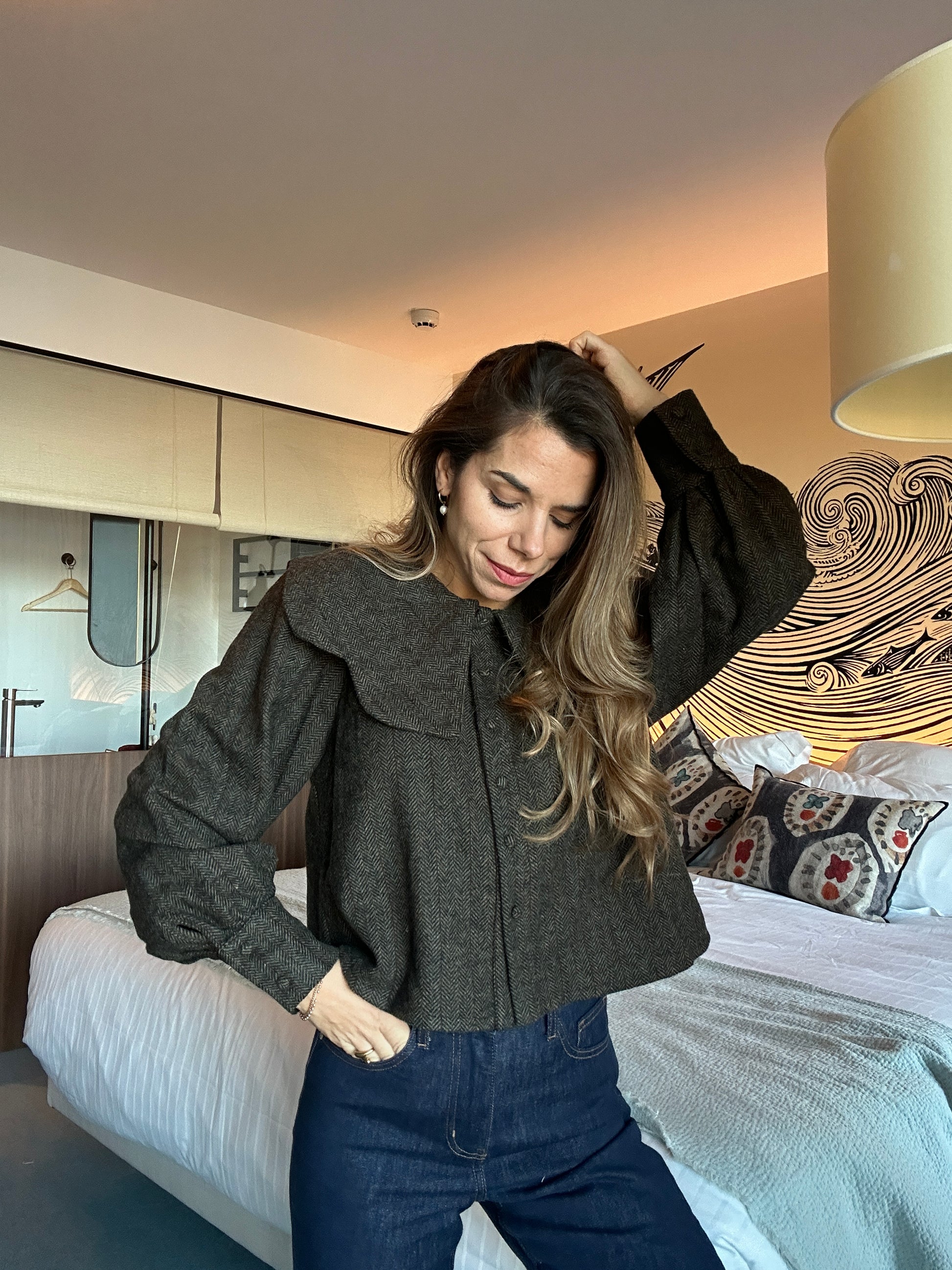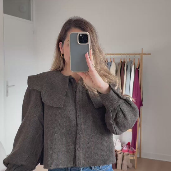 Confectionnée dans une matière douce et légèrement texturée, elle se distingue par ses manches 3/4 bouffantes et sa ligne épurée, parfaite pour créer des looks élégants en toute simplicité. Son coloris marron profond s’accorde facilement avec des tons neutres, du denim ou des matières naturelles.