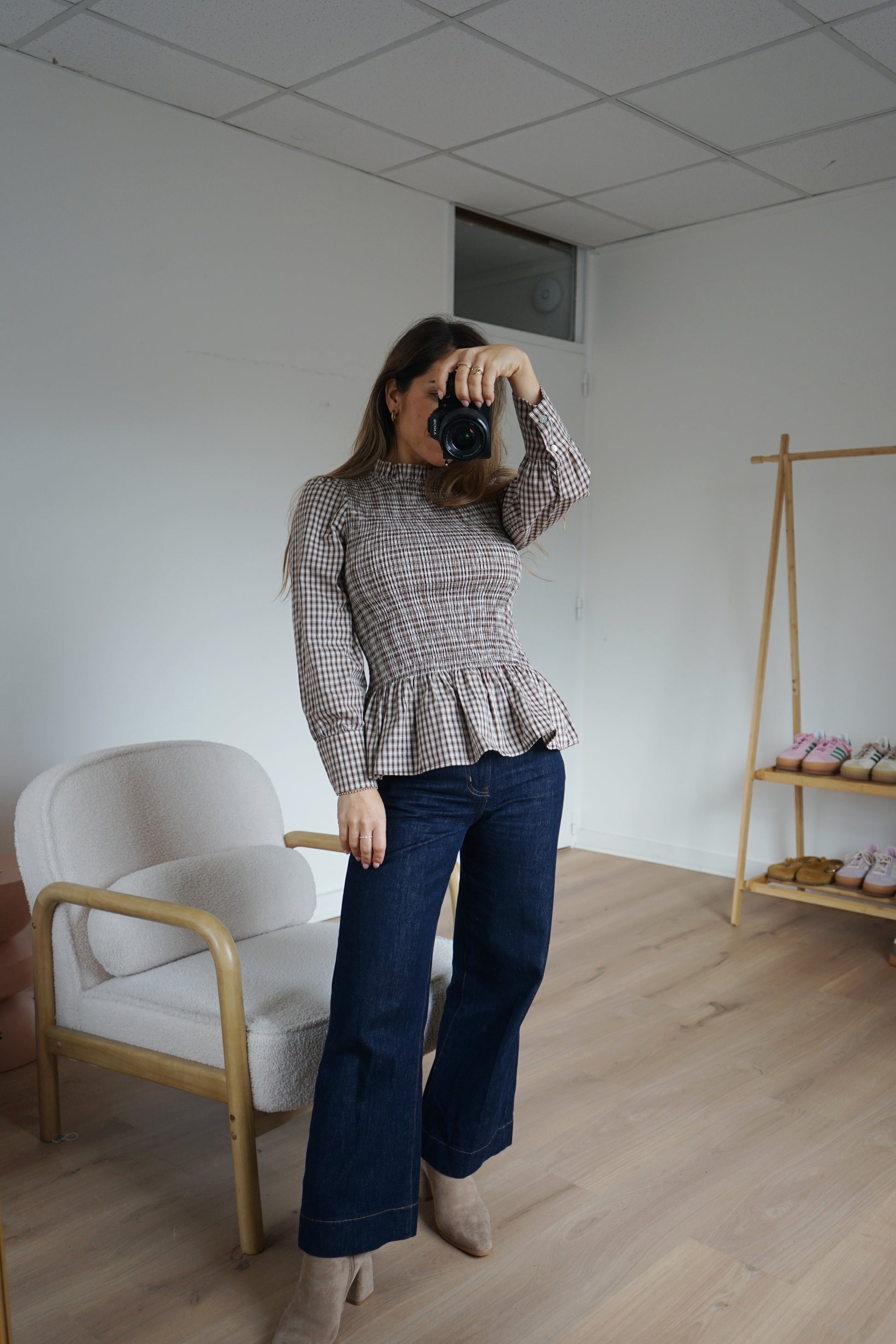 Sublimez votre silhouette avec cette blouse à carreaux au charme intemporel. Son jeu de fronces et son tombé légèrement évasé lui apportent un volume délicat, mettant en valeur la taille tout en offrant un confort absolu.