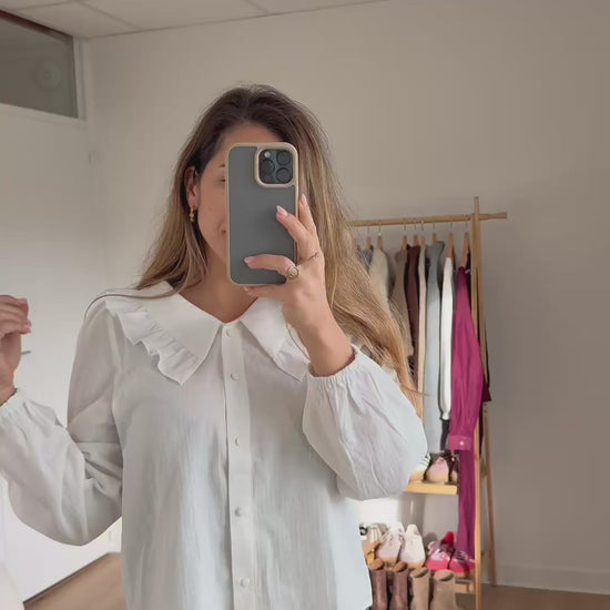 Épurée, lumineuse et résolument féminine, cette blouse blanche à col volanté apporte instantanément une touche chic à n’importe quelle tenue. Son large col orné de volants délicats crée un joli jeu de volume tout en soulignant le port de tête avec élégance.