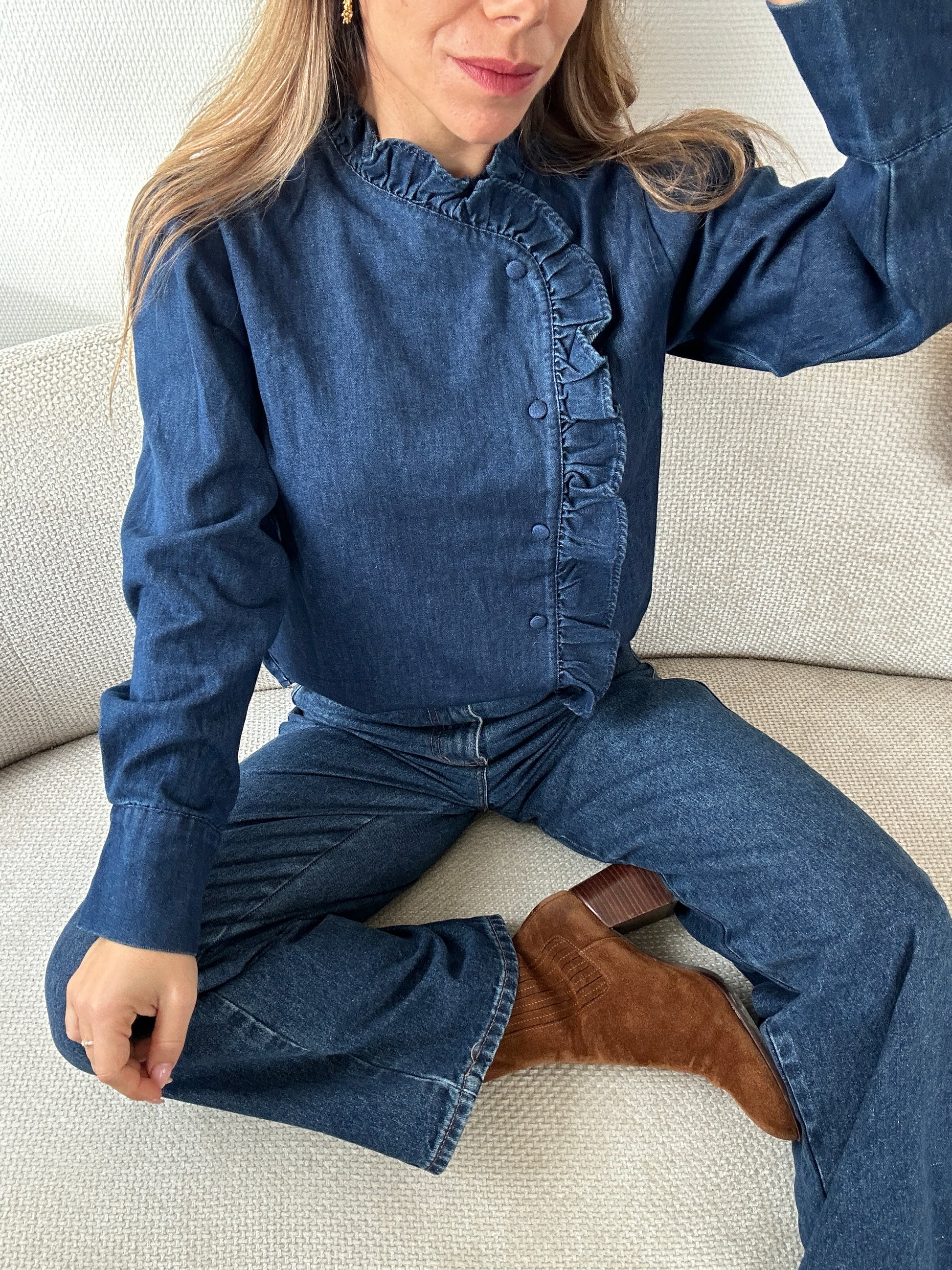 Réinventez le denim avec cette blouse au design unique, mêlant modernité et délicatesse. Confectionnée dans un denim souple et confortable, elle se distingue par son volant asymétrique qui longe la patte de boutonnage et remonte jusqu’au col, apportant une touche féminine et structurée.