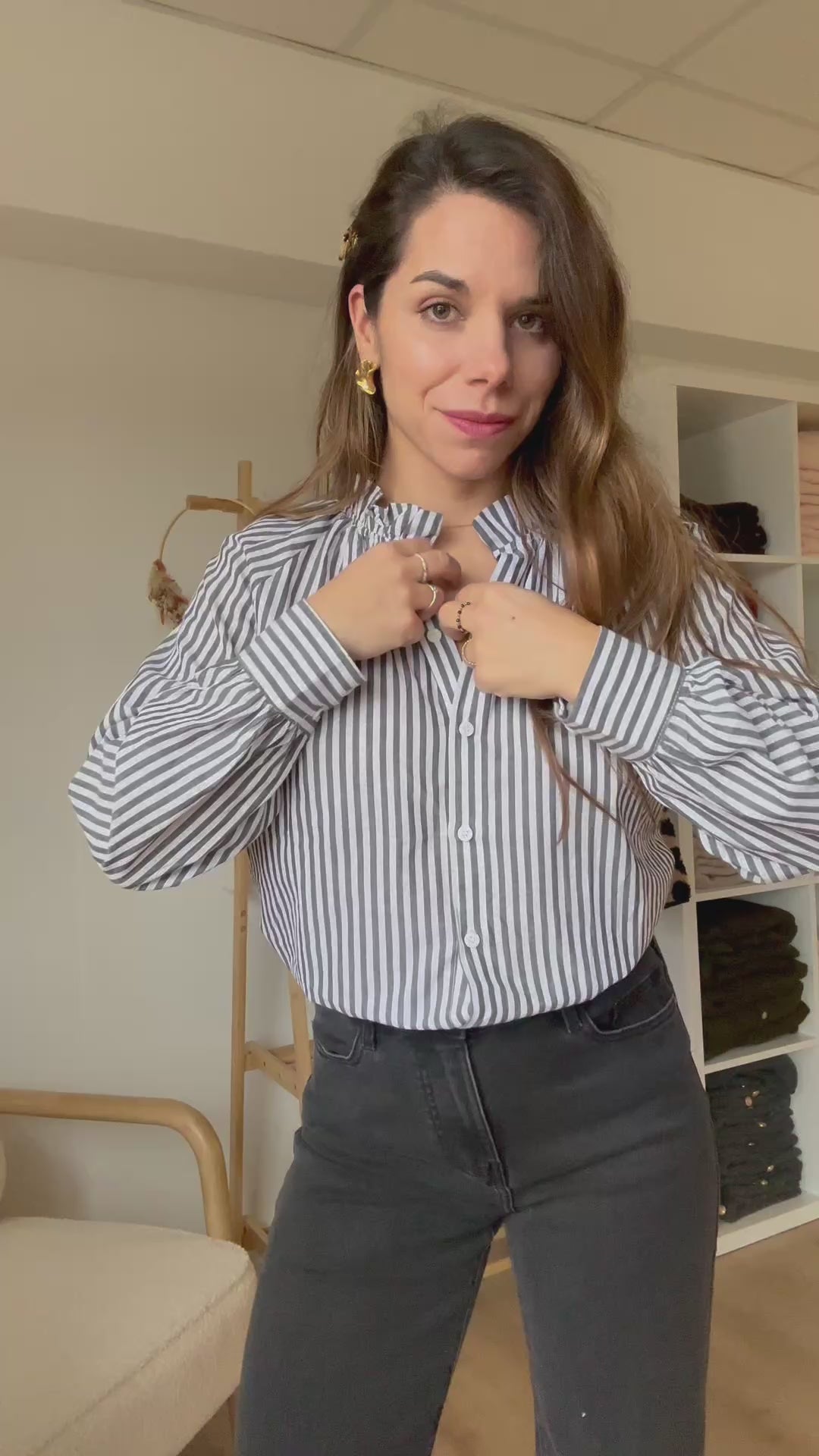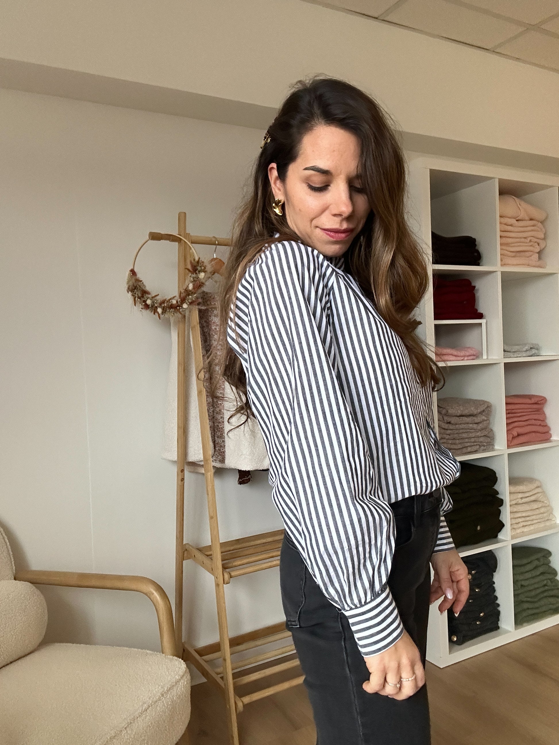 Cette blouse à rayures noires et blanches apporte une touche chic et dynamique à votre garde-robe. Sa coupe fluide et son motif intemporel en font une pièce facile à associer pour un look à la fois élégant et décontracté.