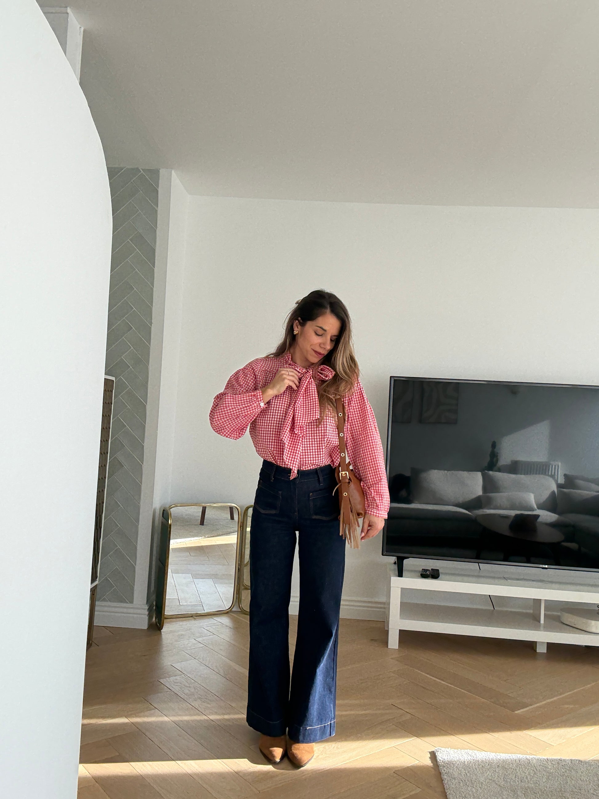 Révélez votre style avec cette blouse, un clin d'oeil chic avec son motif vichy rouge et son élégant col lavallière à nouer, parfaite pour illuminer n'importe quelle tenue !