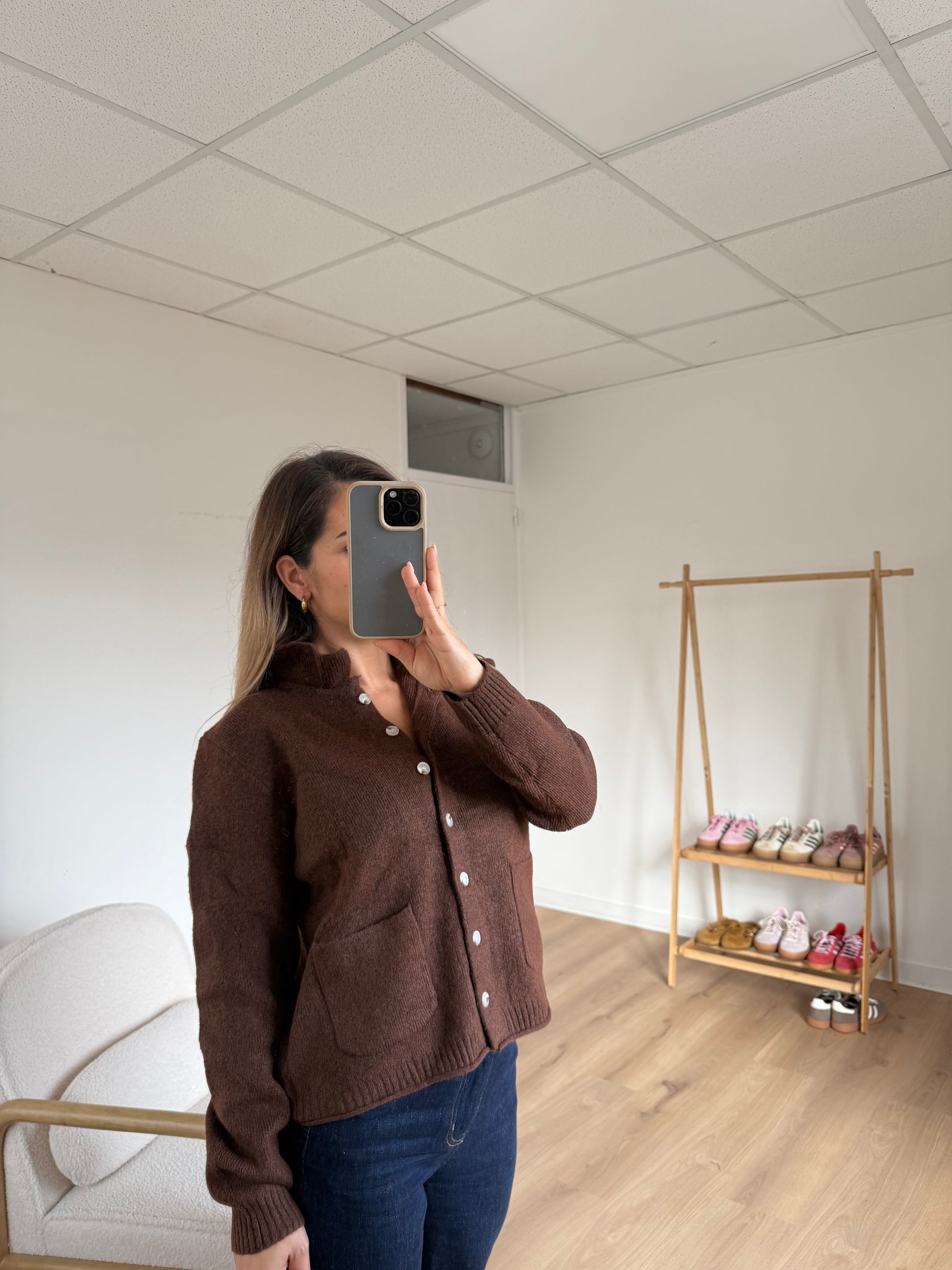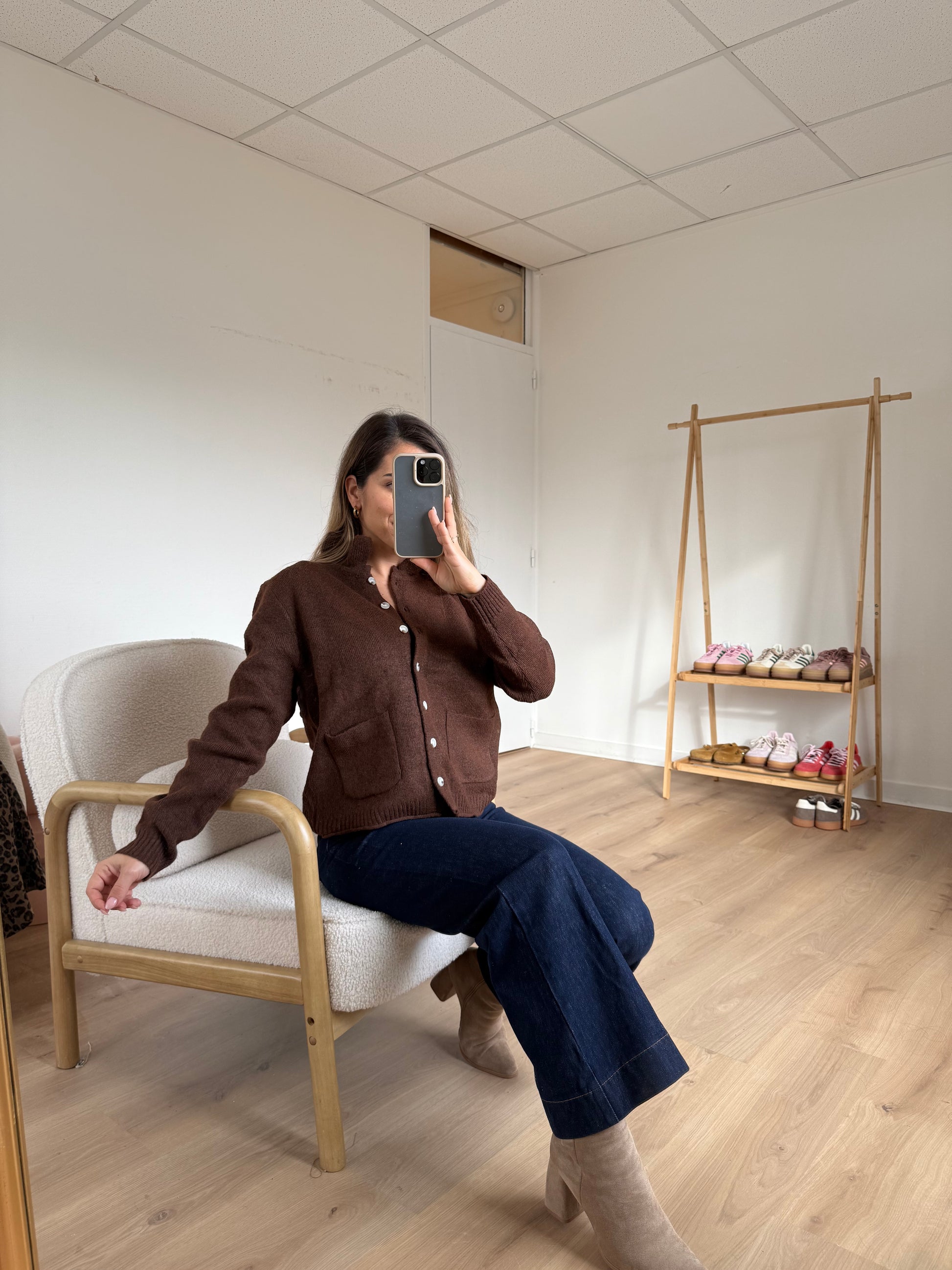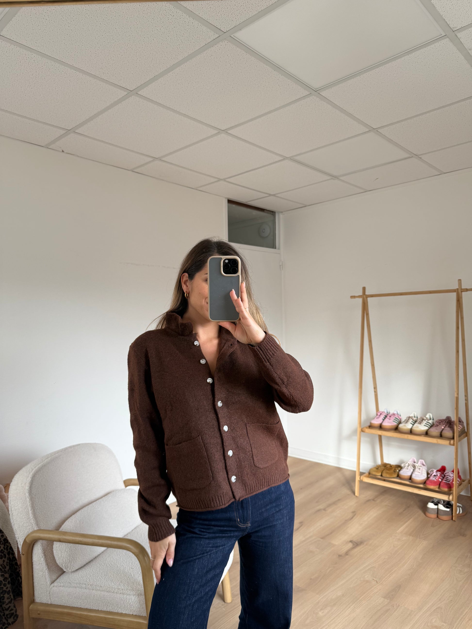 Découvrez notre cardigan Colette à col volanté pour accompagner tous vos looks.