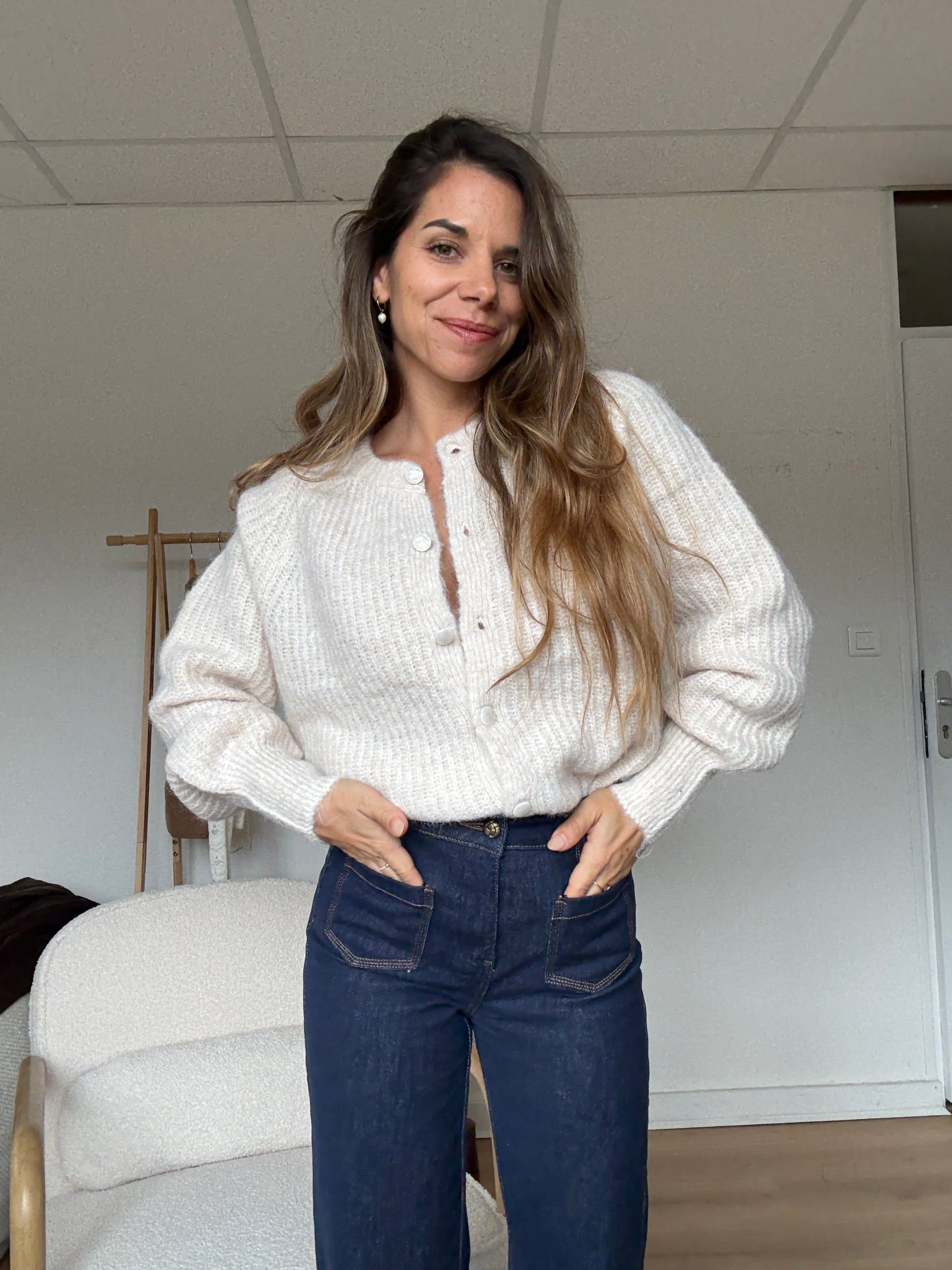 Un cardigan en grosse maille de couleur beige, tout doux et chaleureux, avec de jolis boutons qui font toute la différence. Parfait pour rester bien au chaud avec style !
