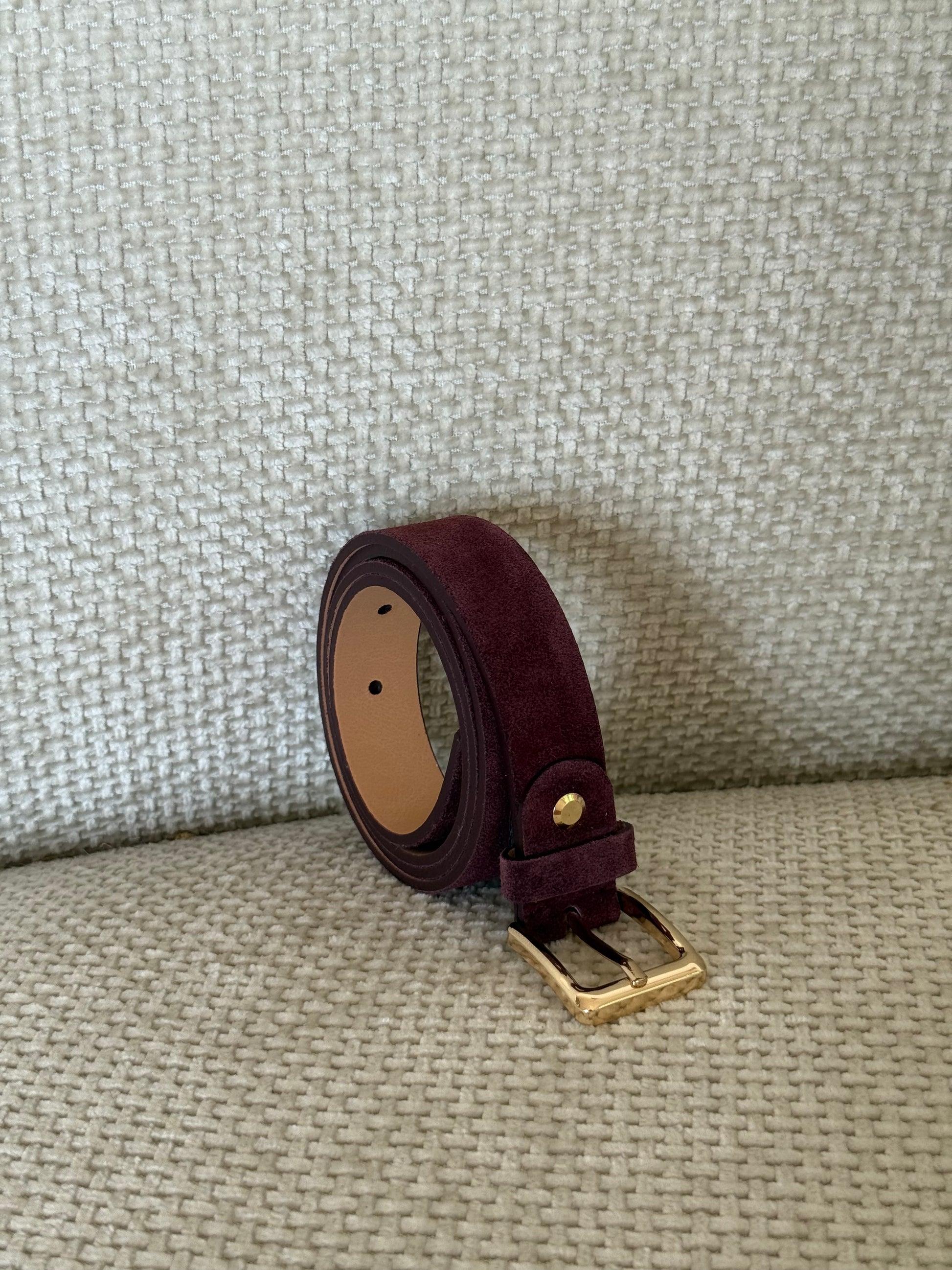L'iconique ceinture en daim bordeaux avec une boucle dorée, pour accompagner vos plus belles tenues. Un must-have !
