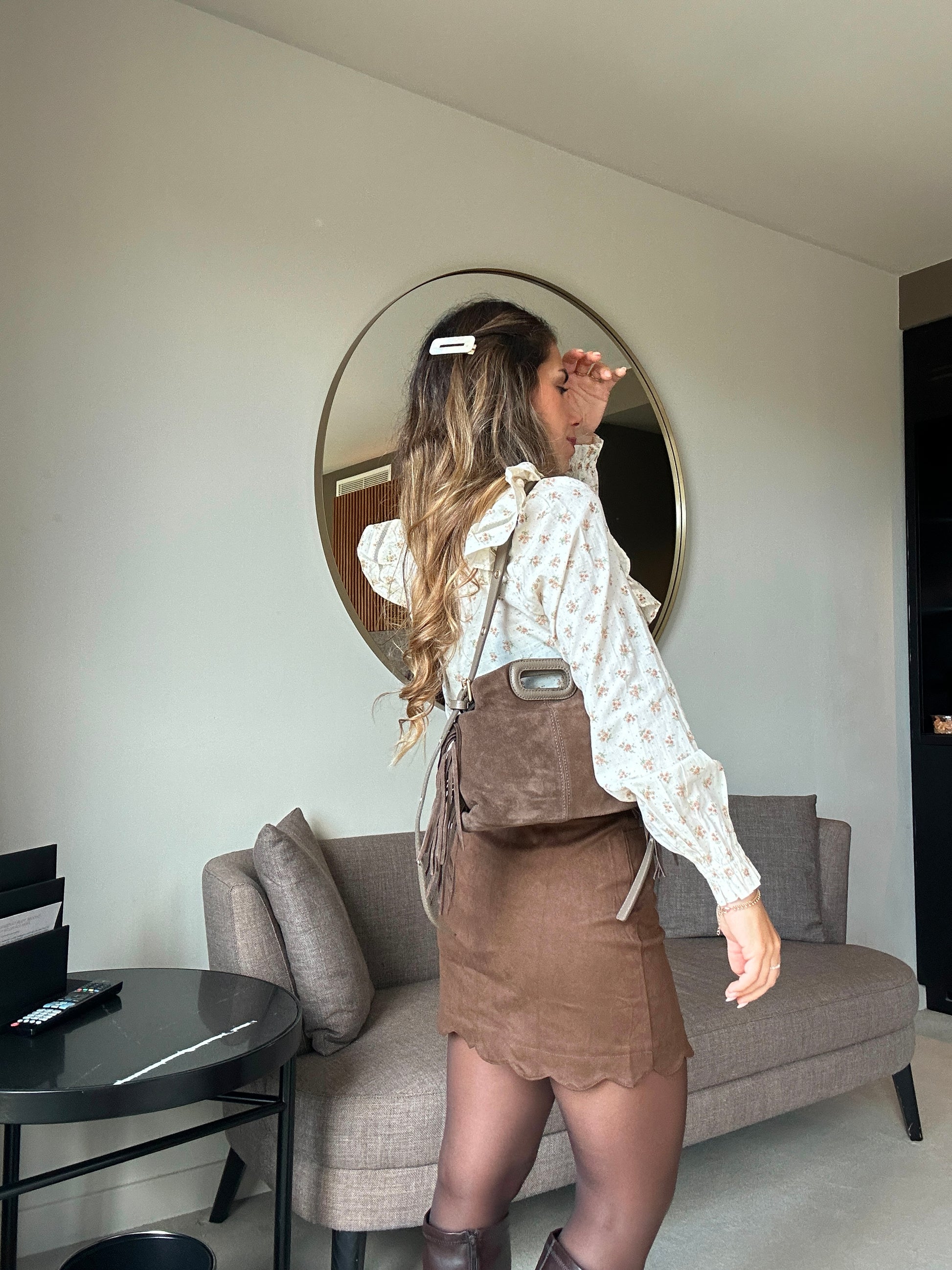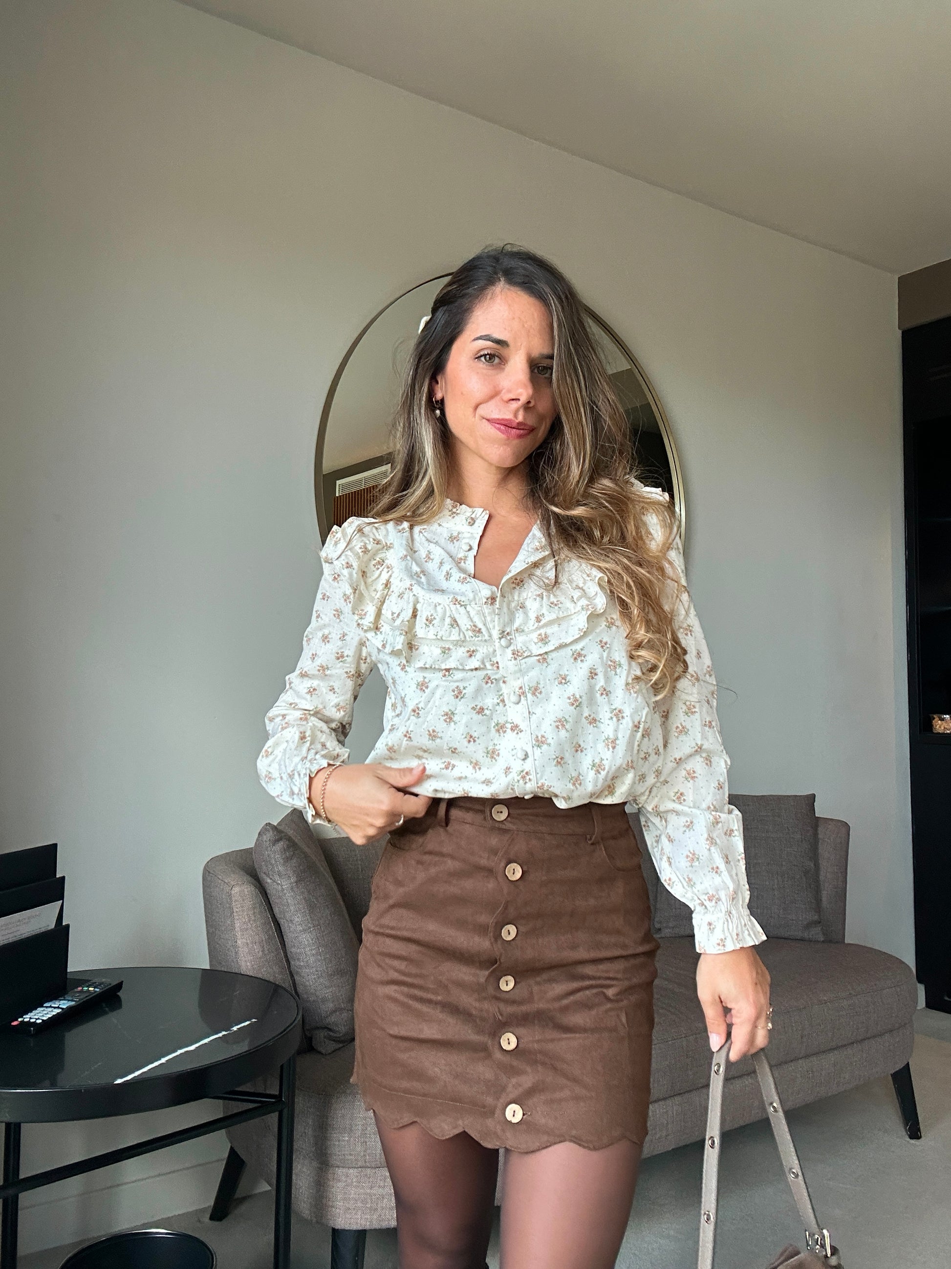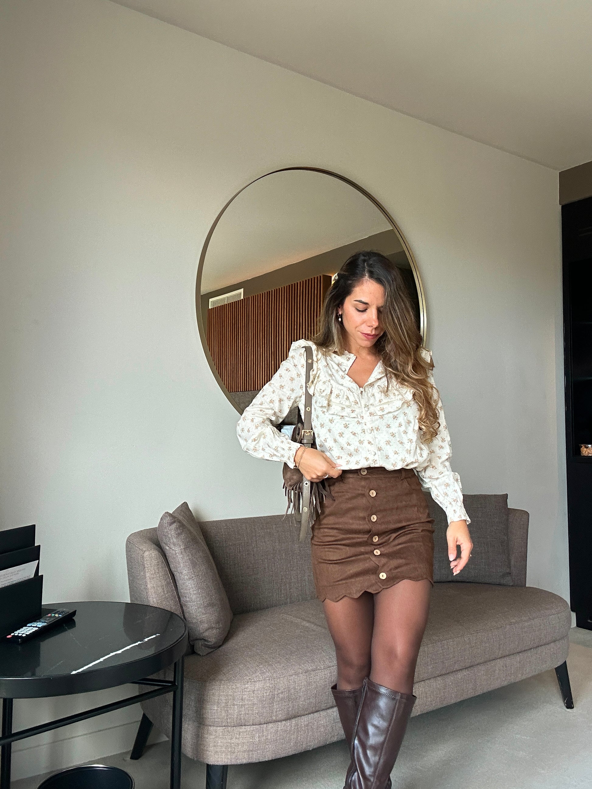 Craquez pour cette jupe en effet daim de couleur marron ! Parfaite pour apporter une touche élégante à votre tenue.
