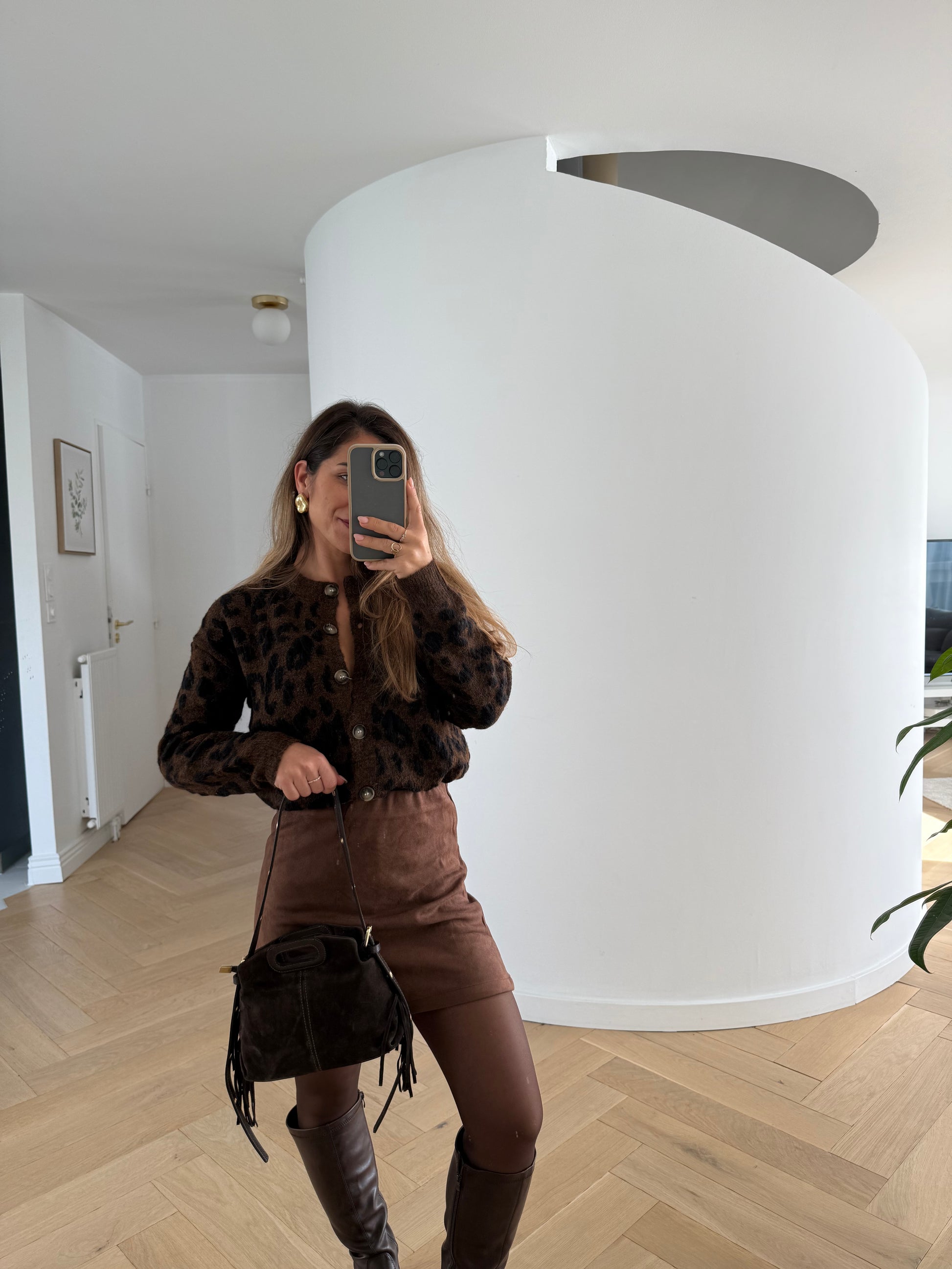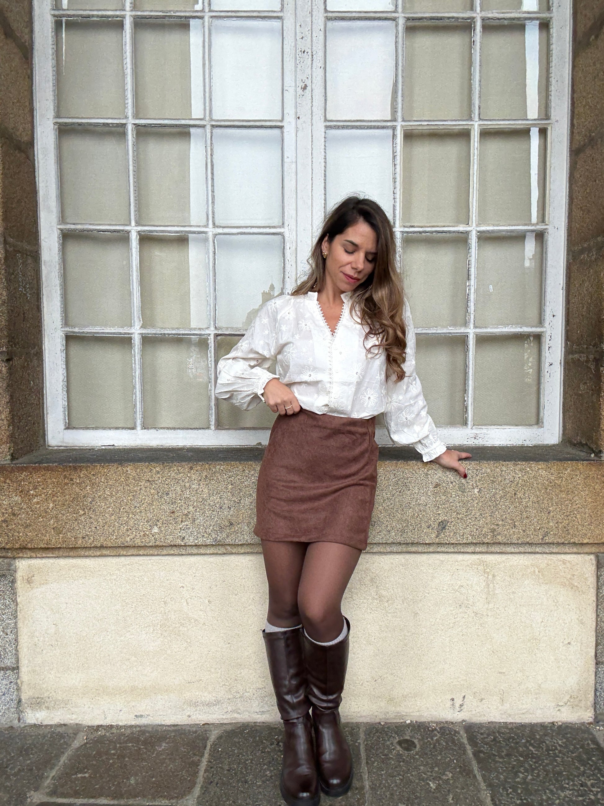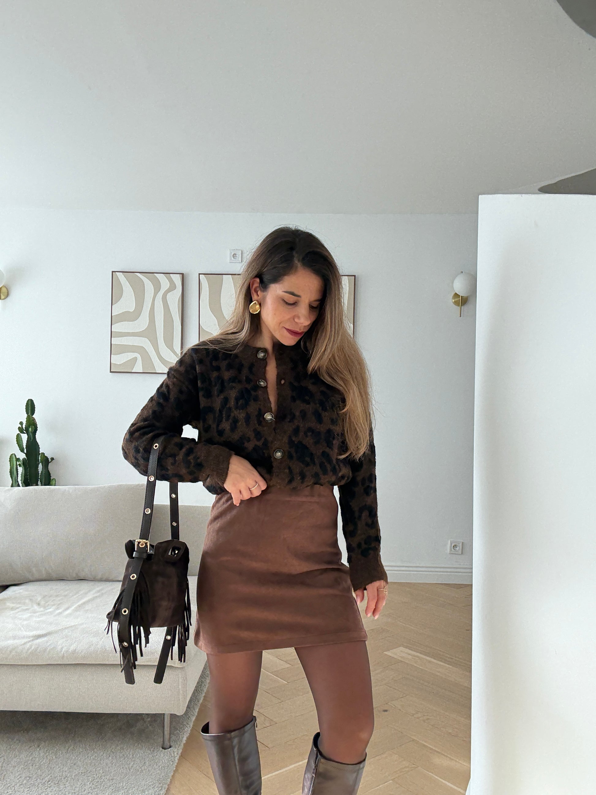 Craquez pour cette jupe suédine de couleur marron ! Parfaite pour apporter une touche élégante à votre tenue.