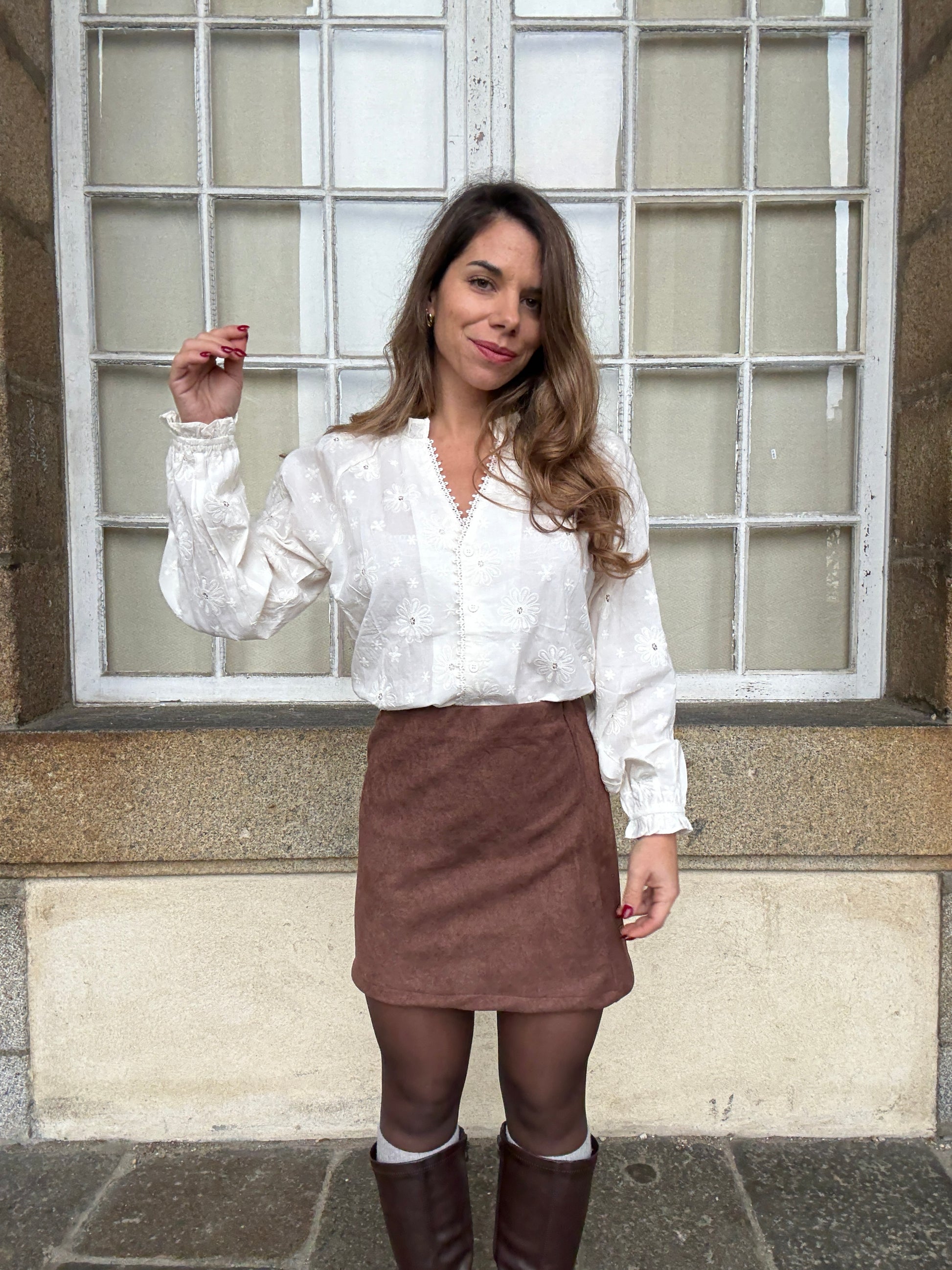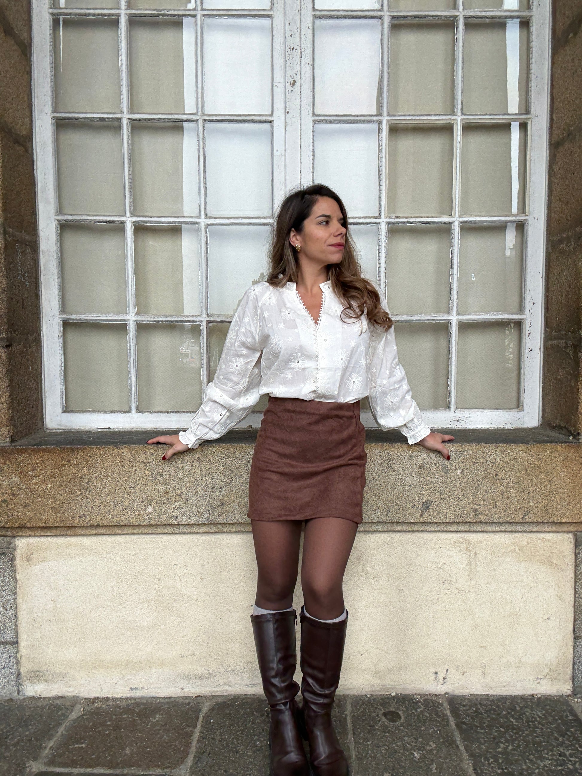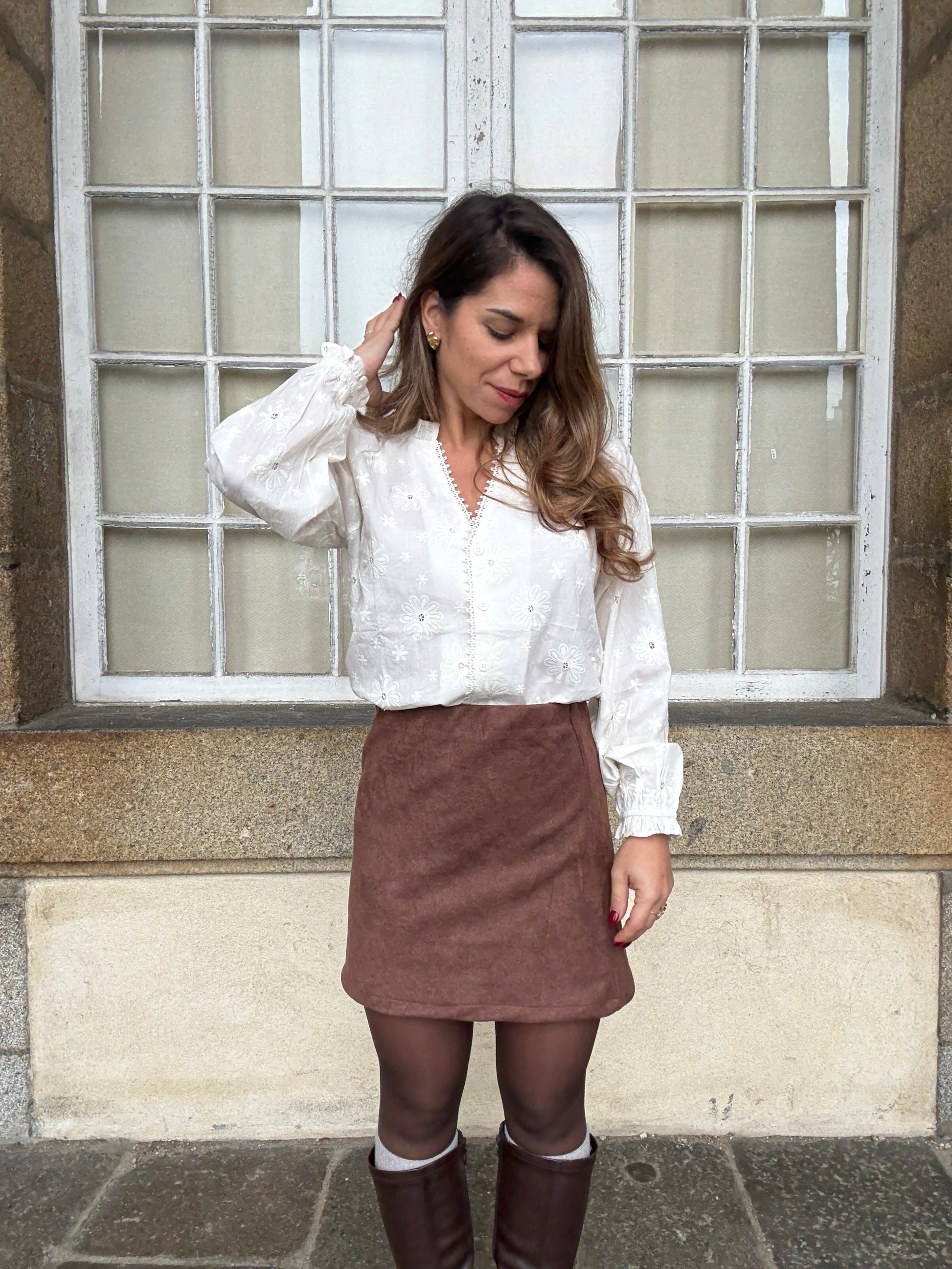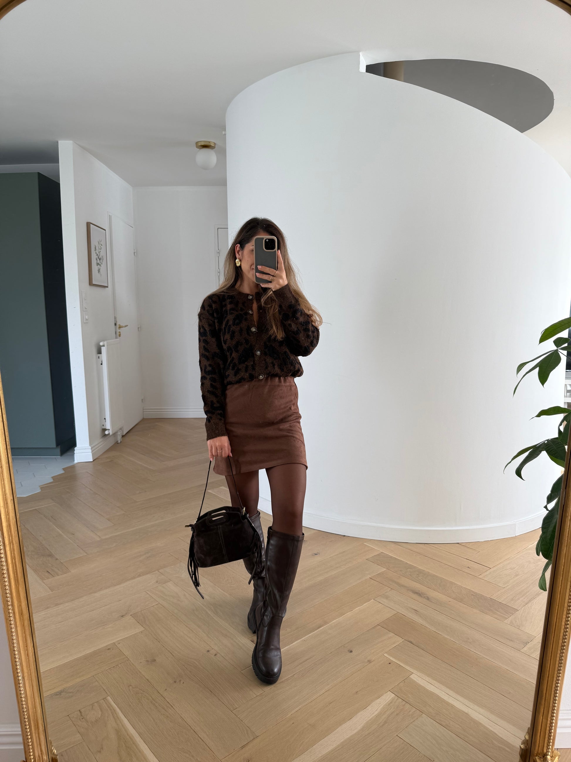 Craquez pour cette jupe suédine de couleur marron ! Parfaite pour apporter une touche élégante à votre tenue.