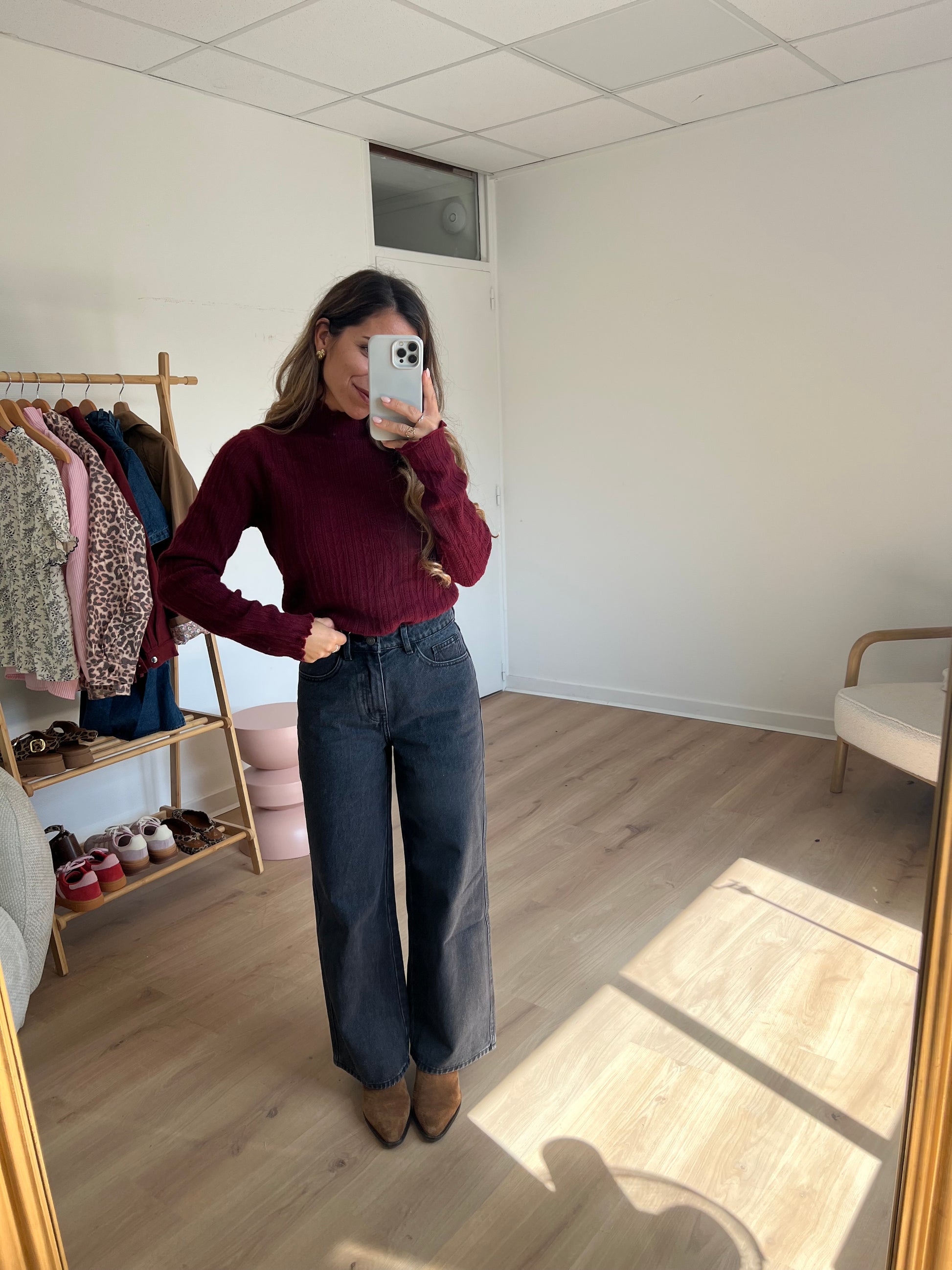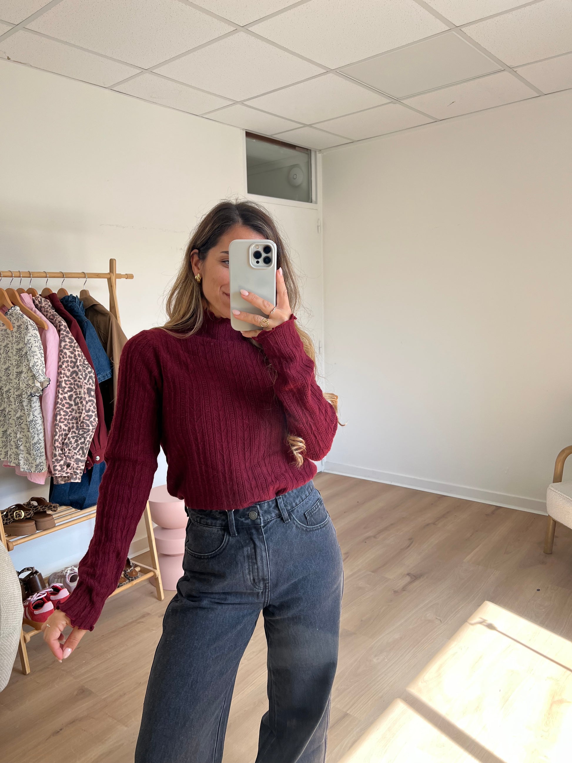 Optez pour ce pull couleur bordeaux, fin et ultra doux, avec de jolis détails texturés dans la maille. Son col et ses manches légèrement volantés apportent une touche féminine et élégante. Il peut se porter seul ou en l'associant avec un gilet berger.