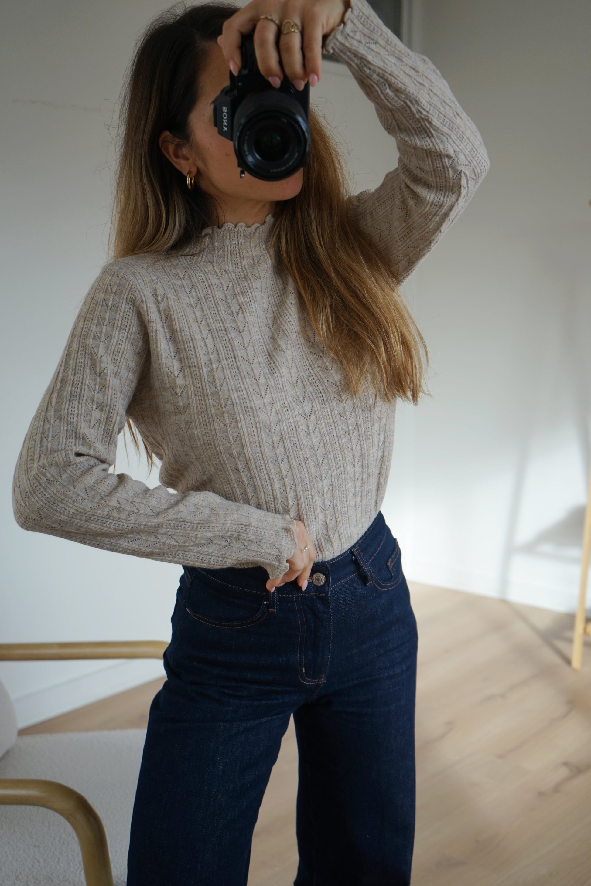 avec de jolis détails texturés dans la maille. Son col et ses manches légèrement volantés apportent une touche féminine et élégante. Il peut se porter seul ou en l'associant avec un gilet berger.