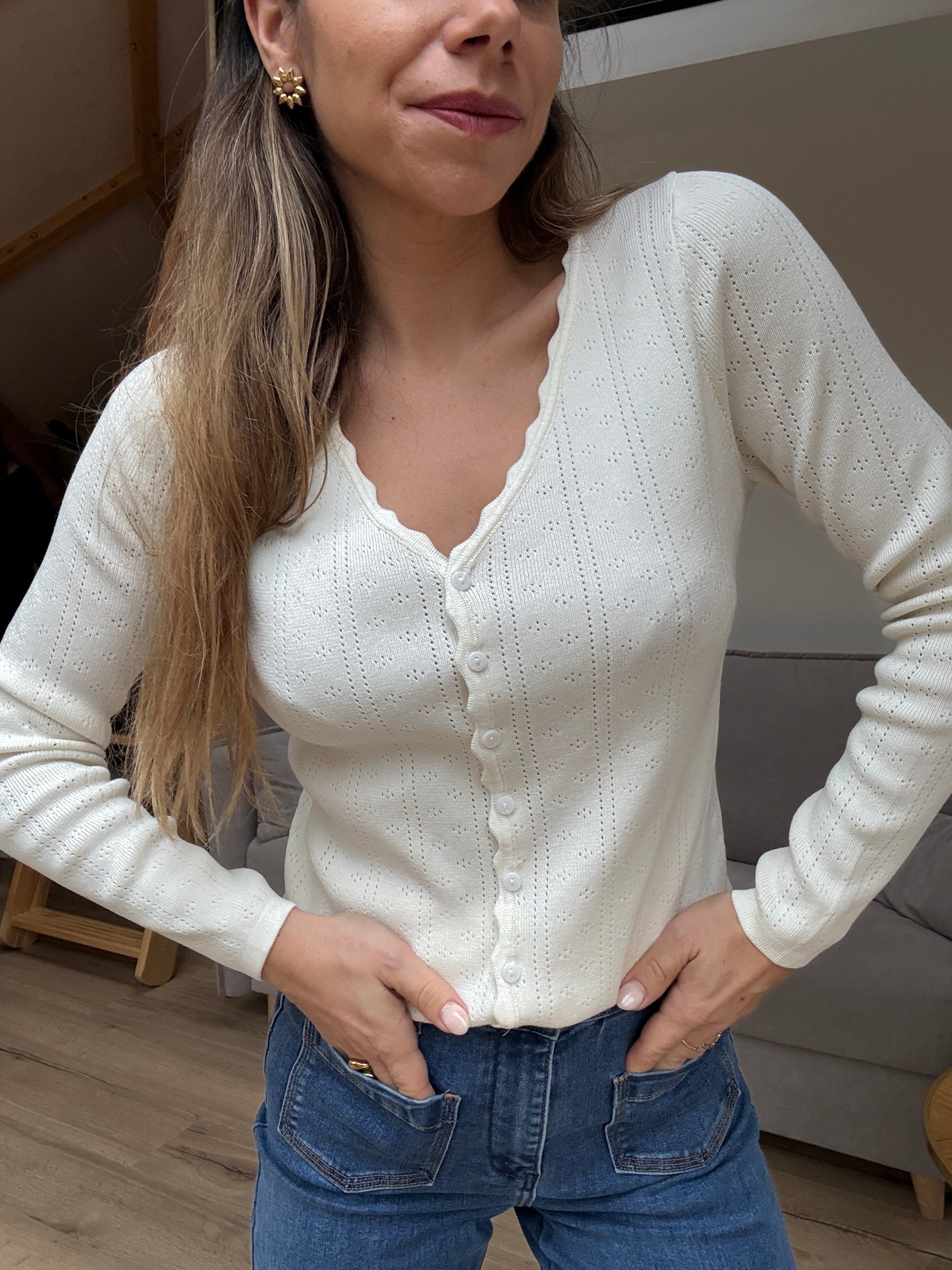 Optez pour ce pull couleur écrue, fin et ultra doux, avec son col V à dentelle ! Un indispensable pour créer un joli look au quotidien, en le portant seul ou en l'associant avec un gilet berger.