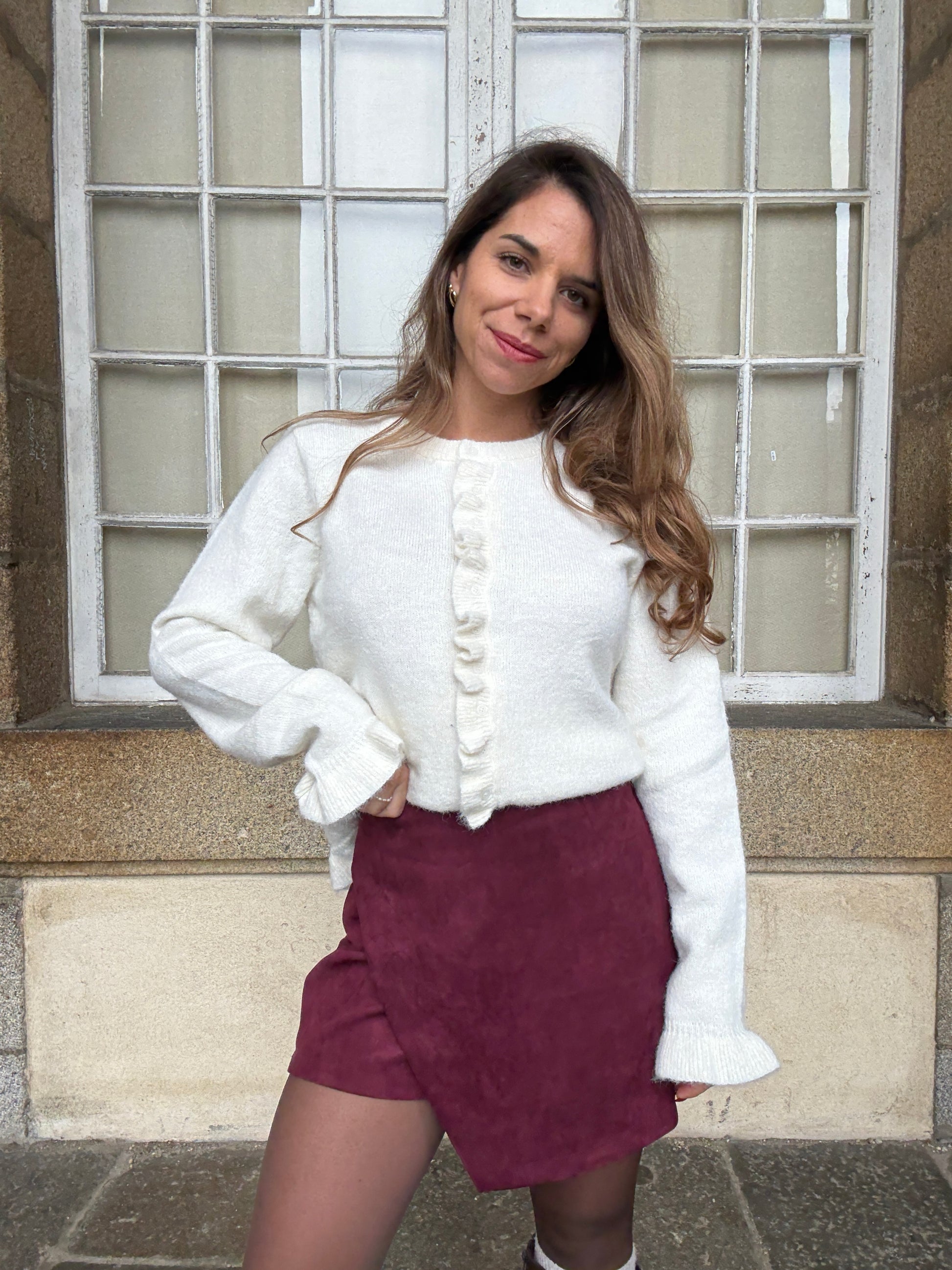 Ce délicat pull fin beige, orné de jolis volants au poignets et d'une patte de boutonnage soyeuse, ajoutera une touche de féminité et d'élégance à toutes vos tenues.
