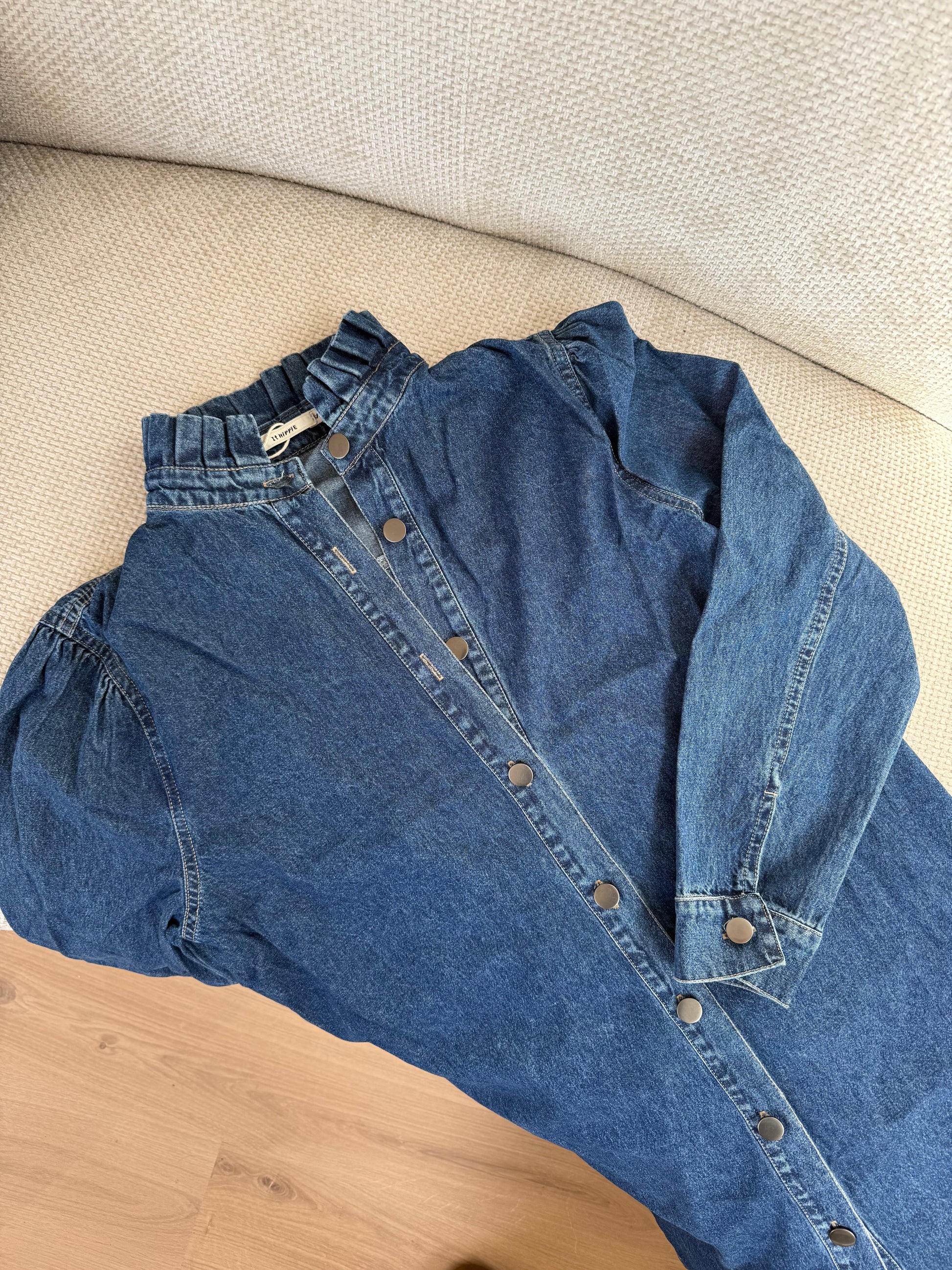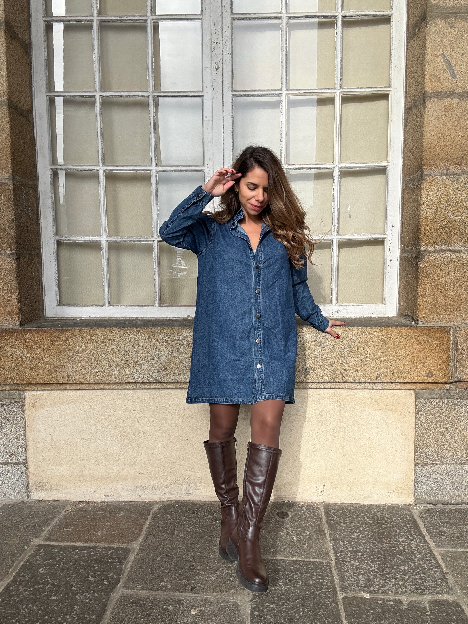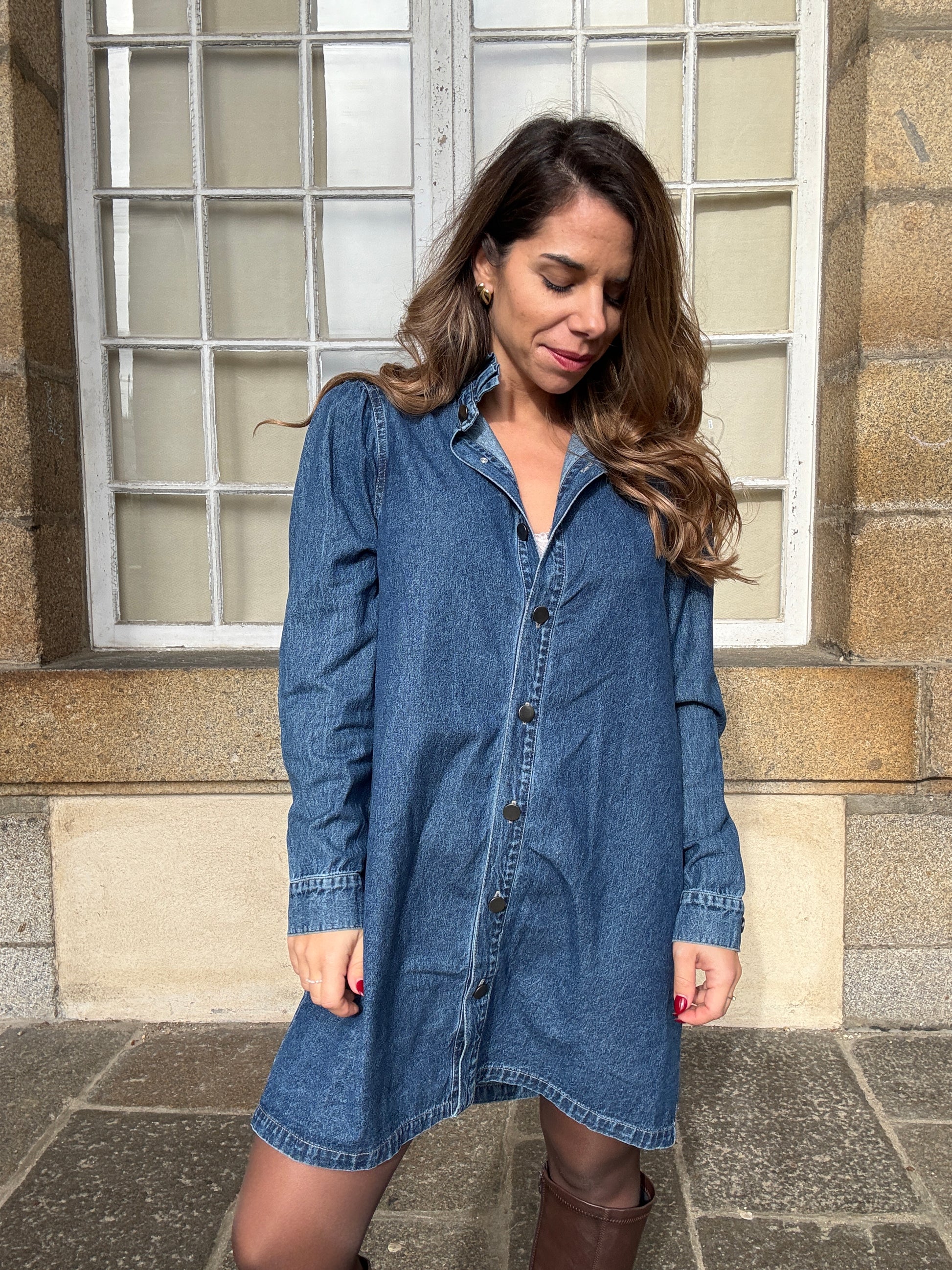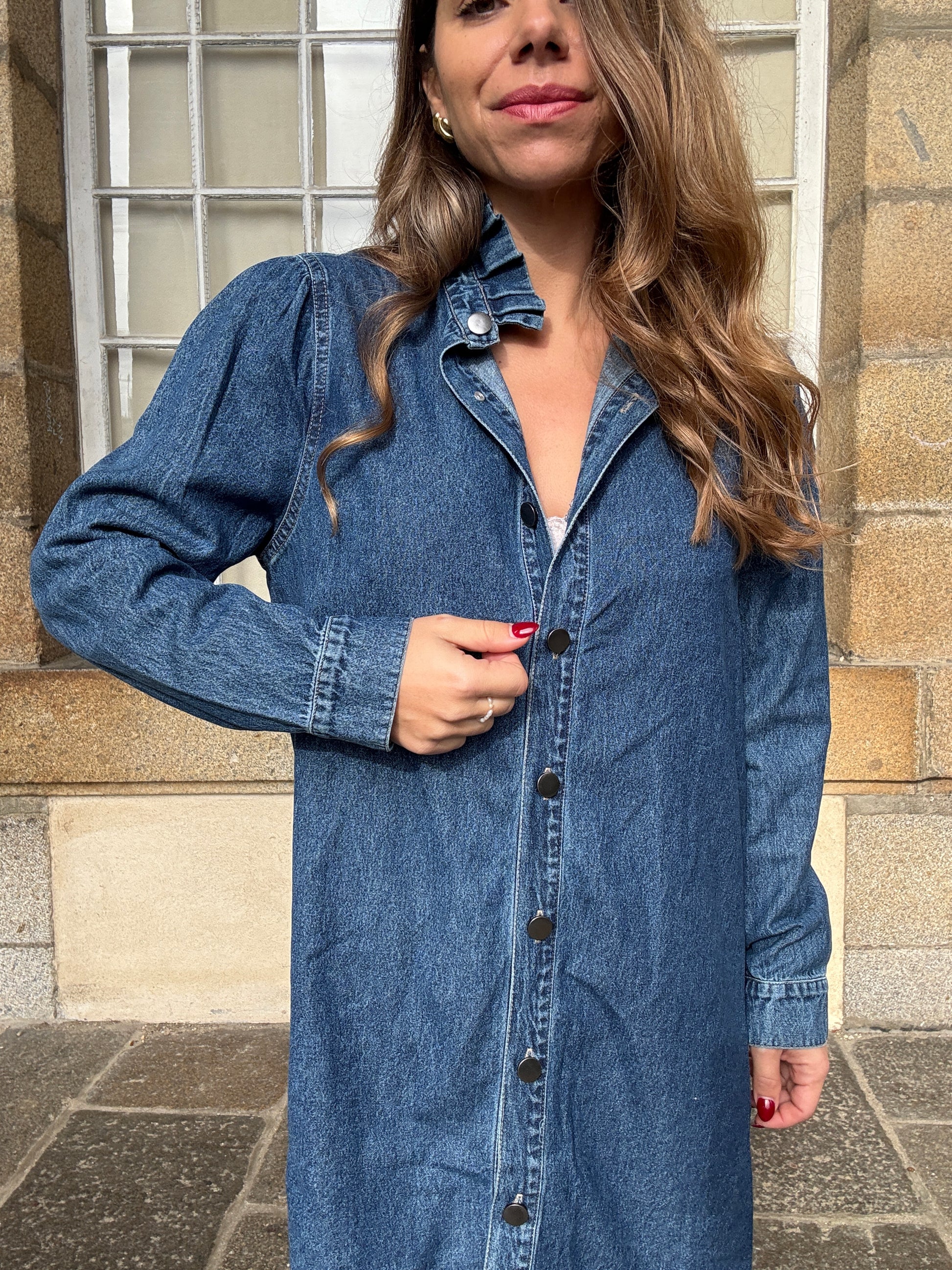 La robe en jean Marion à manches longues est une jolie robe en jean intemporelle avec un col à volants. La version manche longues peut se porter facilement en automne !