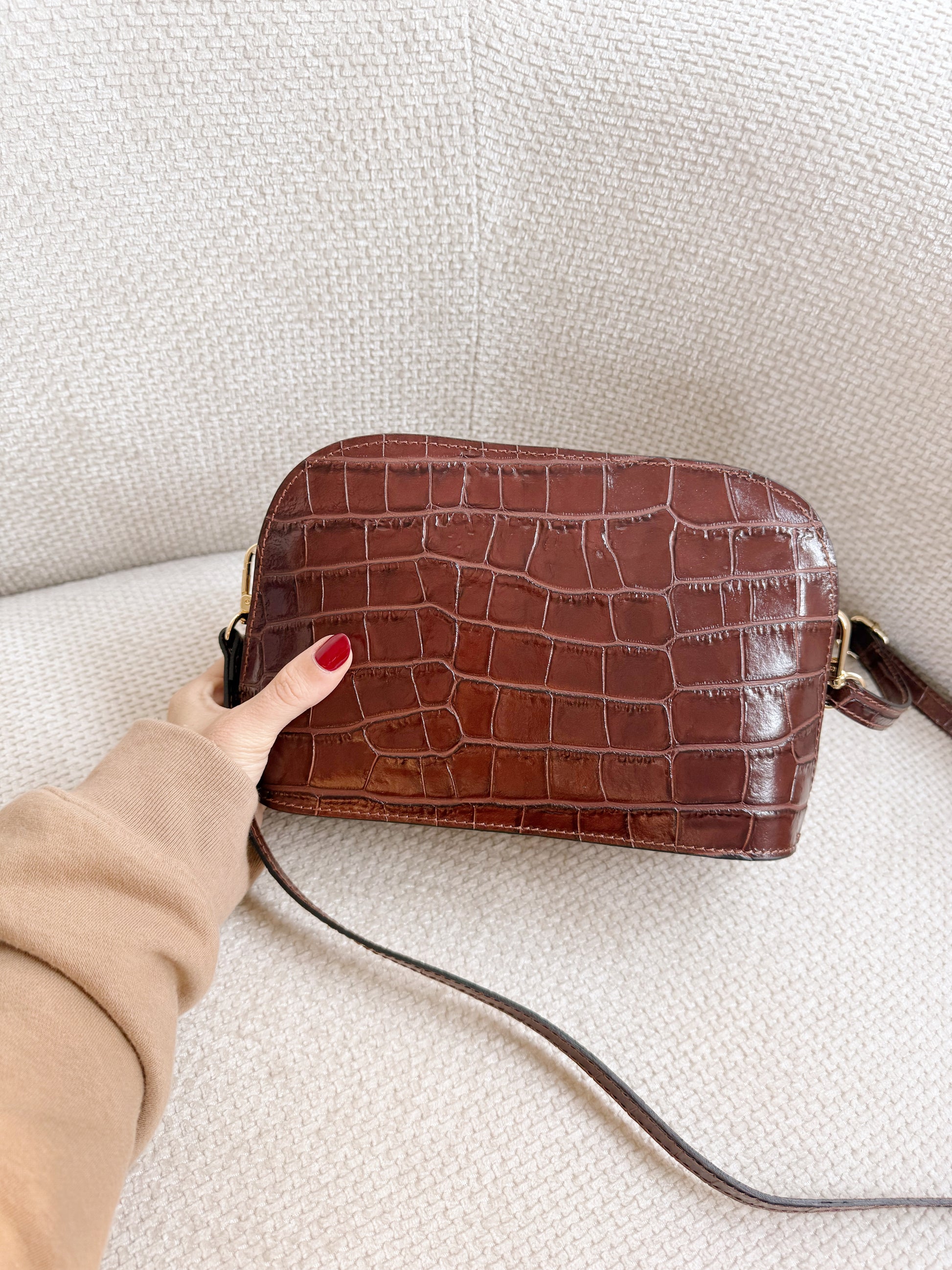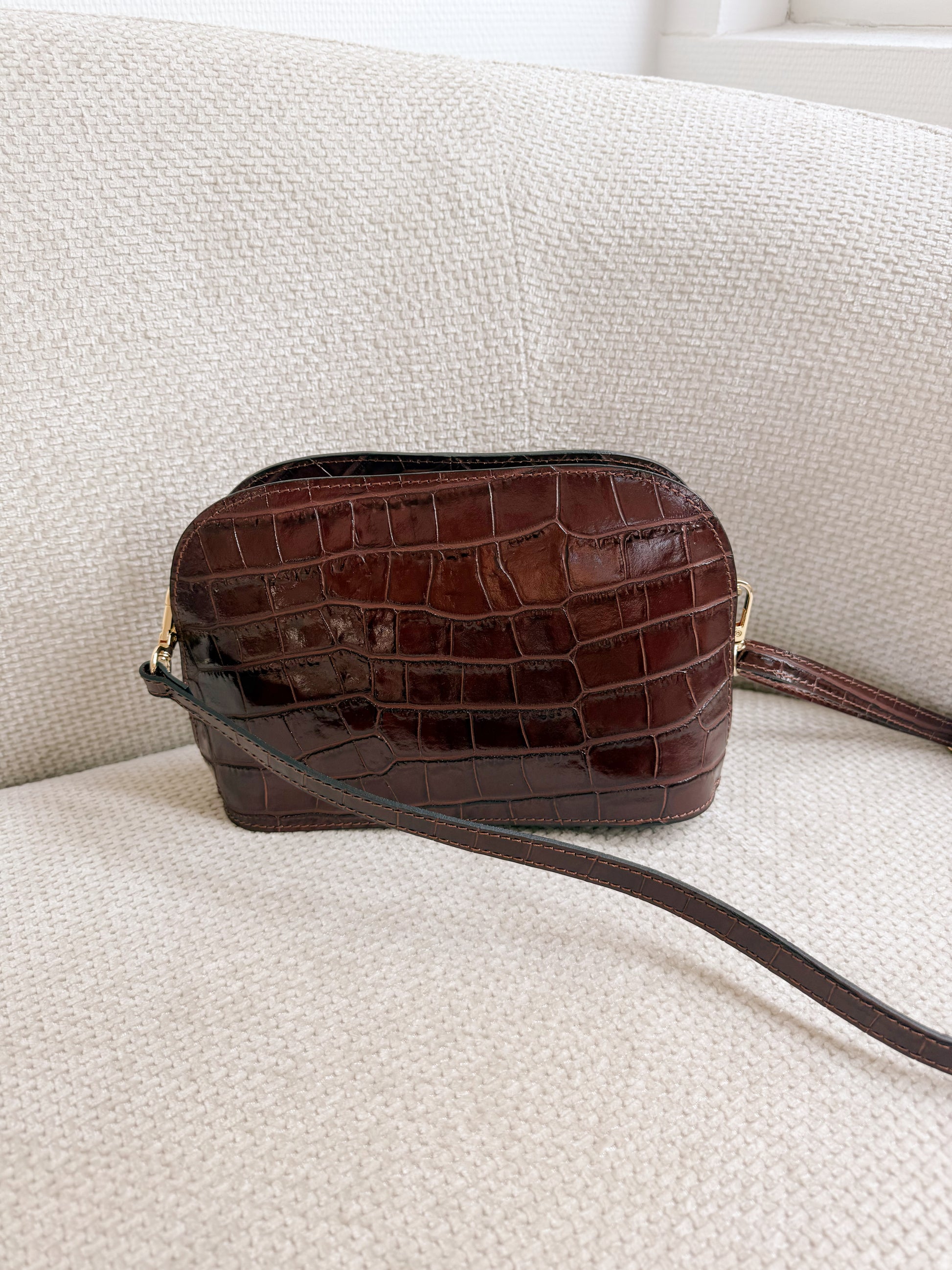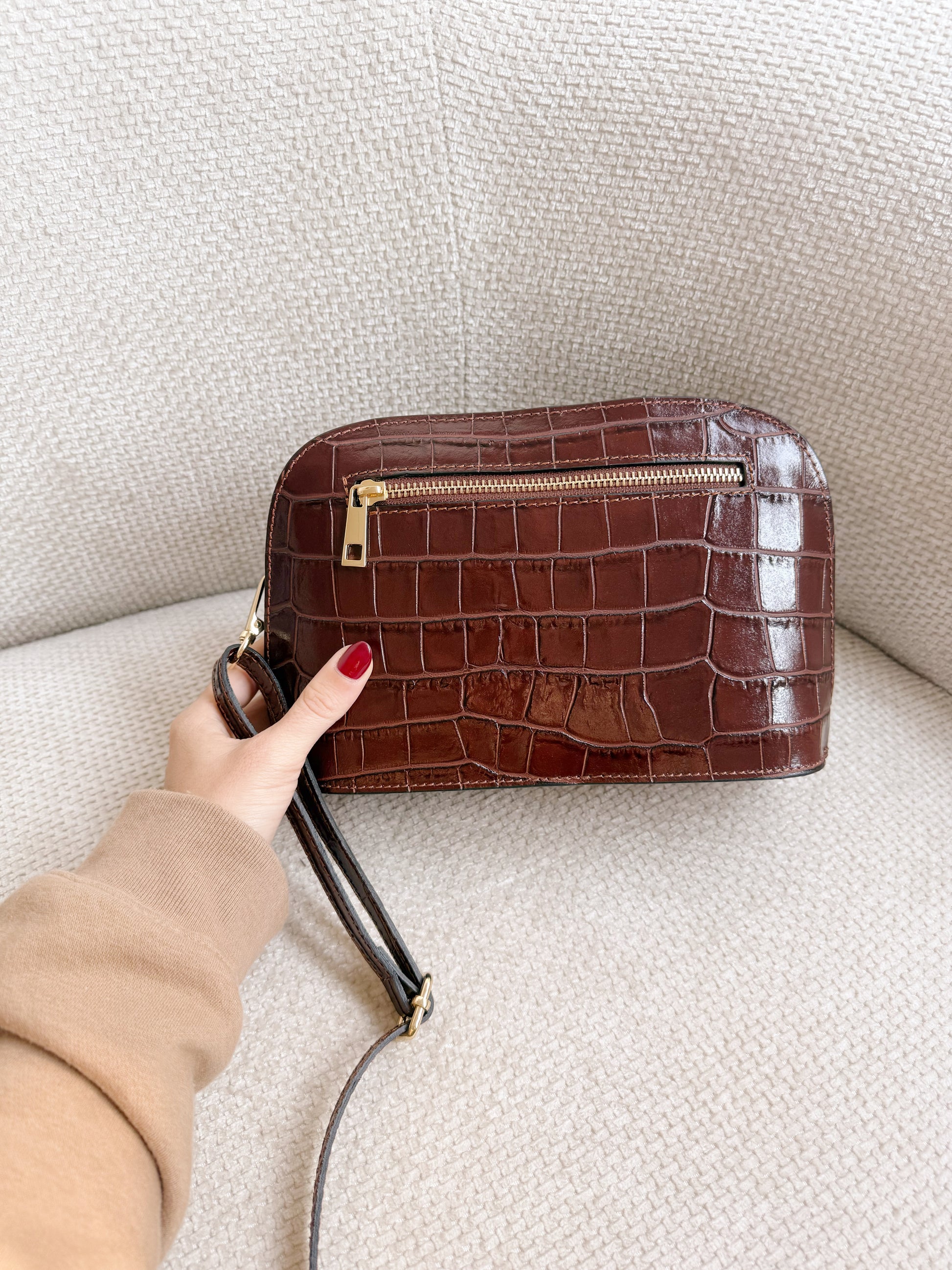 Découvrez notre joli sac à main Côme. Un sac en 100% cuir, fabriqué en Italie avec un bel imprimé croco.