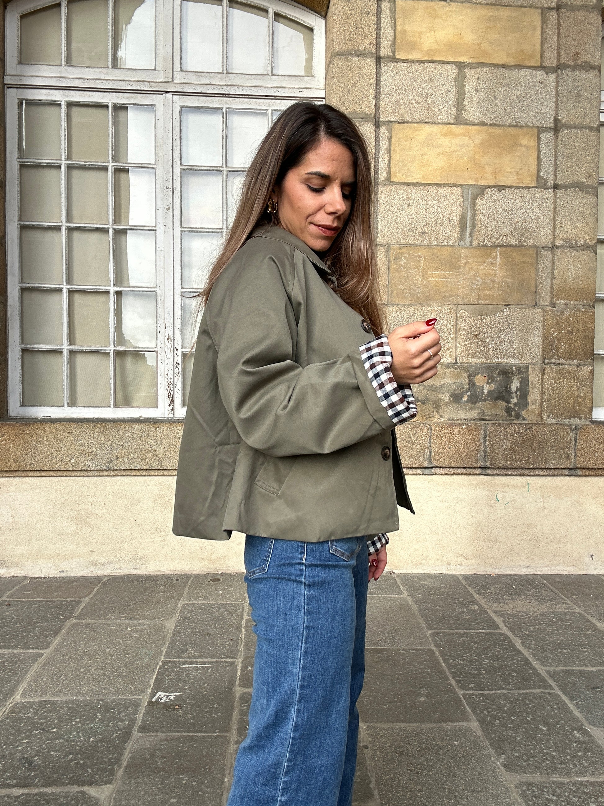 Craquez pour notre trench court kaki Dalia, doté d’un intérieur en vichy pour une touche originale. Parfait pour la mi-saison, il se porte facilement sur toutes vos tenues, du casual au plus habillé. Convient du 36 au 40/42.