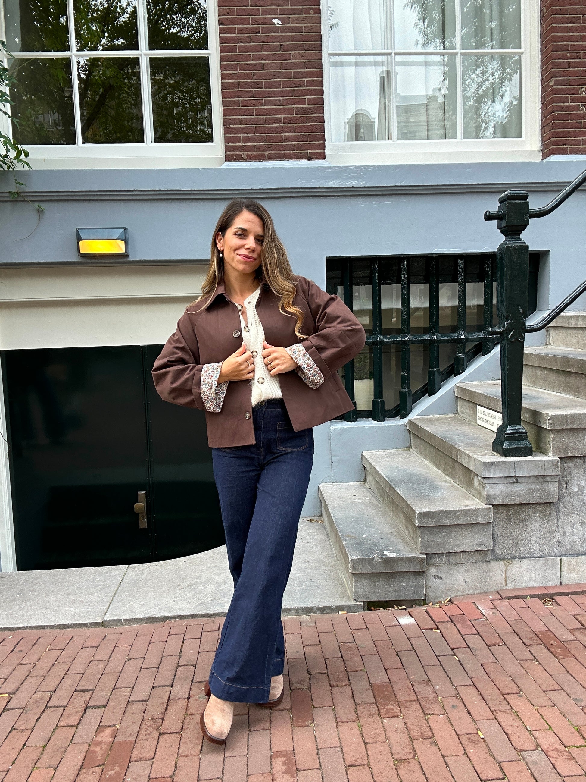 Cette petite veste en coton marron mise sur la simplicité avec une coupe épurée et un col classique. Son détail fleuri aux poignets ajoute une touche de fantaisie et de fraîcheur pour égayer n'importe quelle tenue !